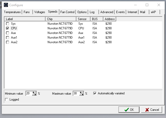 Der Lüfter lässt sich wunderbar Regeln, habe ihn bei Speeds ausgewählt und er wird auf der Startseite von SpeedFan angezeigt, dort steht als Standardwert jedoch 50%, ich stelle ihn auf 20%, der Rechner ist auf dem Tisch und dümpelt bei 33°C.