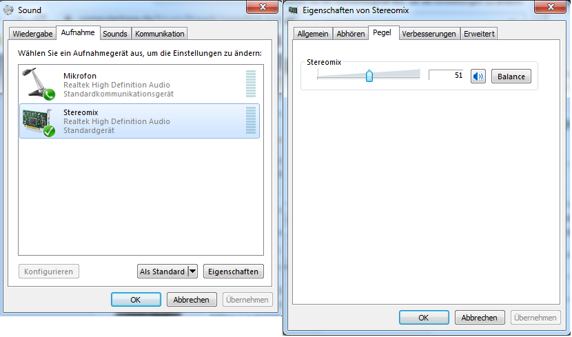 Der Stereomix ist der falsche, den bitte deaktivieren (rechte Maustaste auf den Eintrag und "Deaktivieren" anklicken) - es darf/sollte nur ein Eintrag mit dem grünen Haken aufgeführt werden.