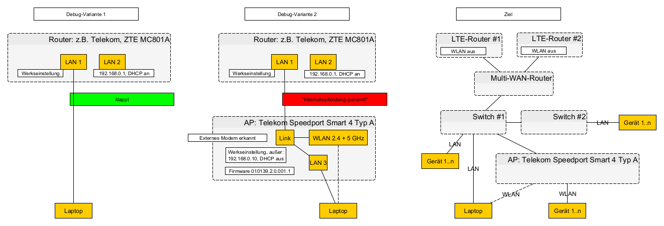 Die Kabel funktionieren, der LTE-Router ansich funktioniert, mit anderem LTE-Router am Link-Port des Speedport identisches Verhalten.