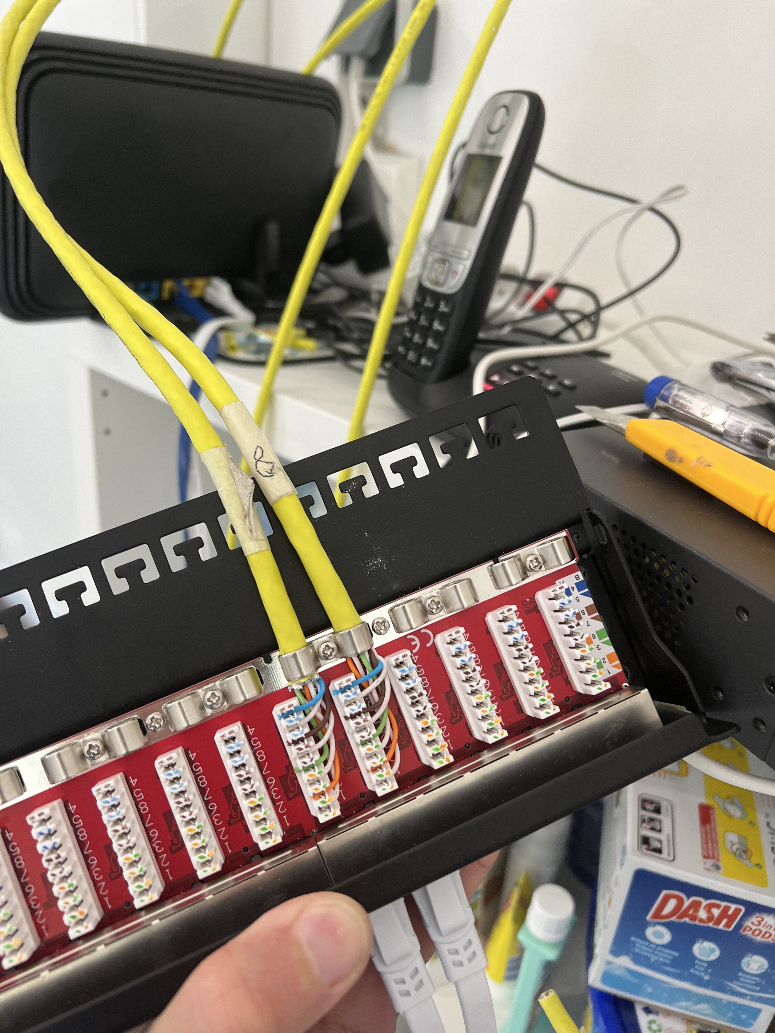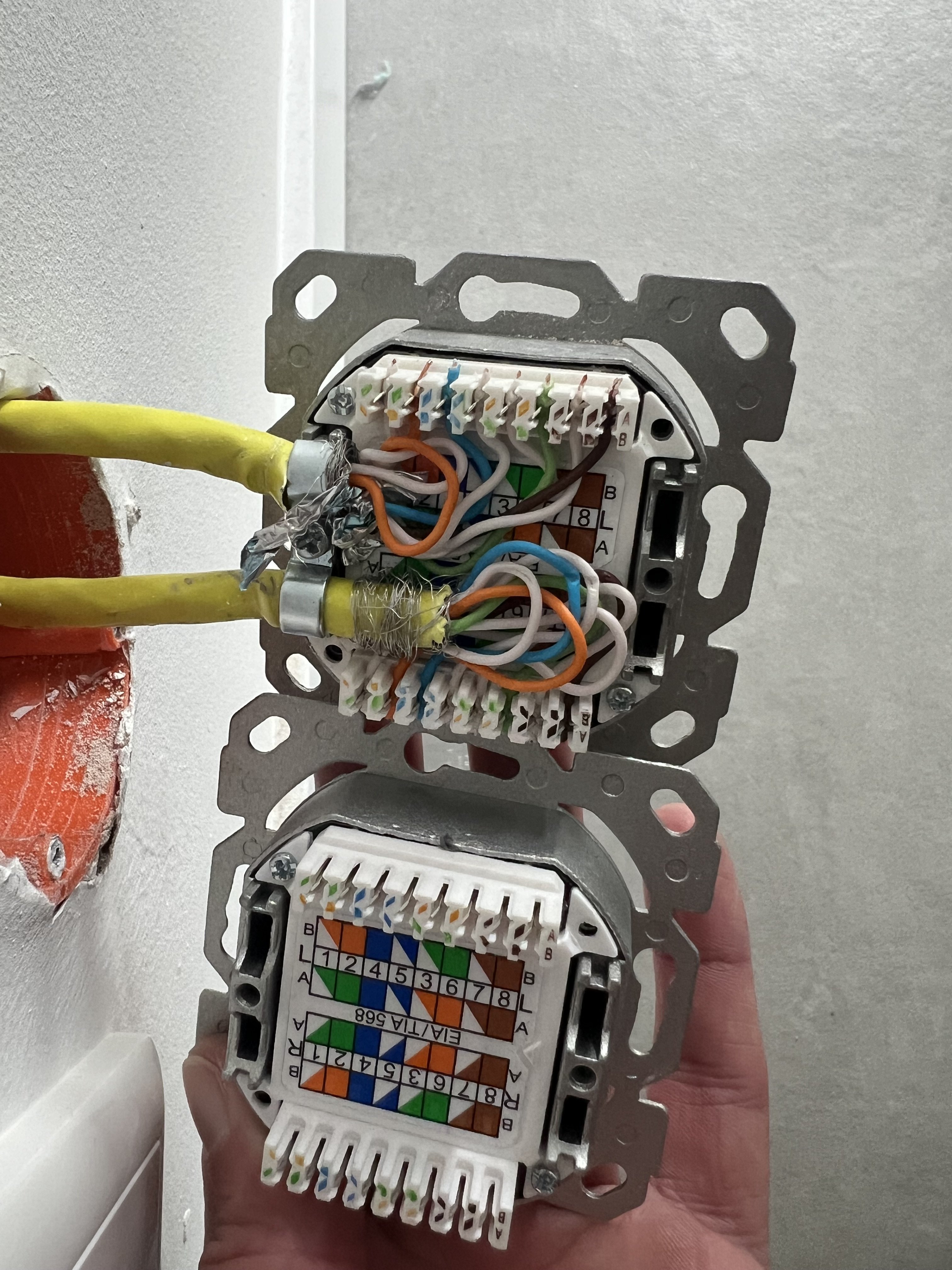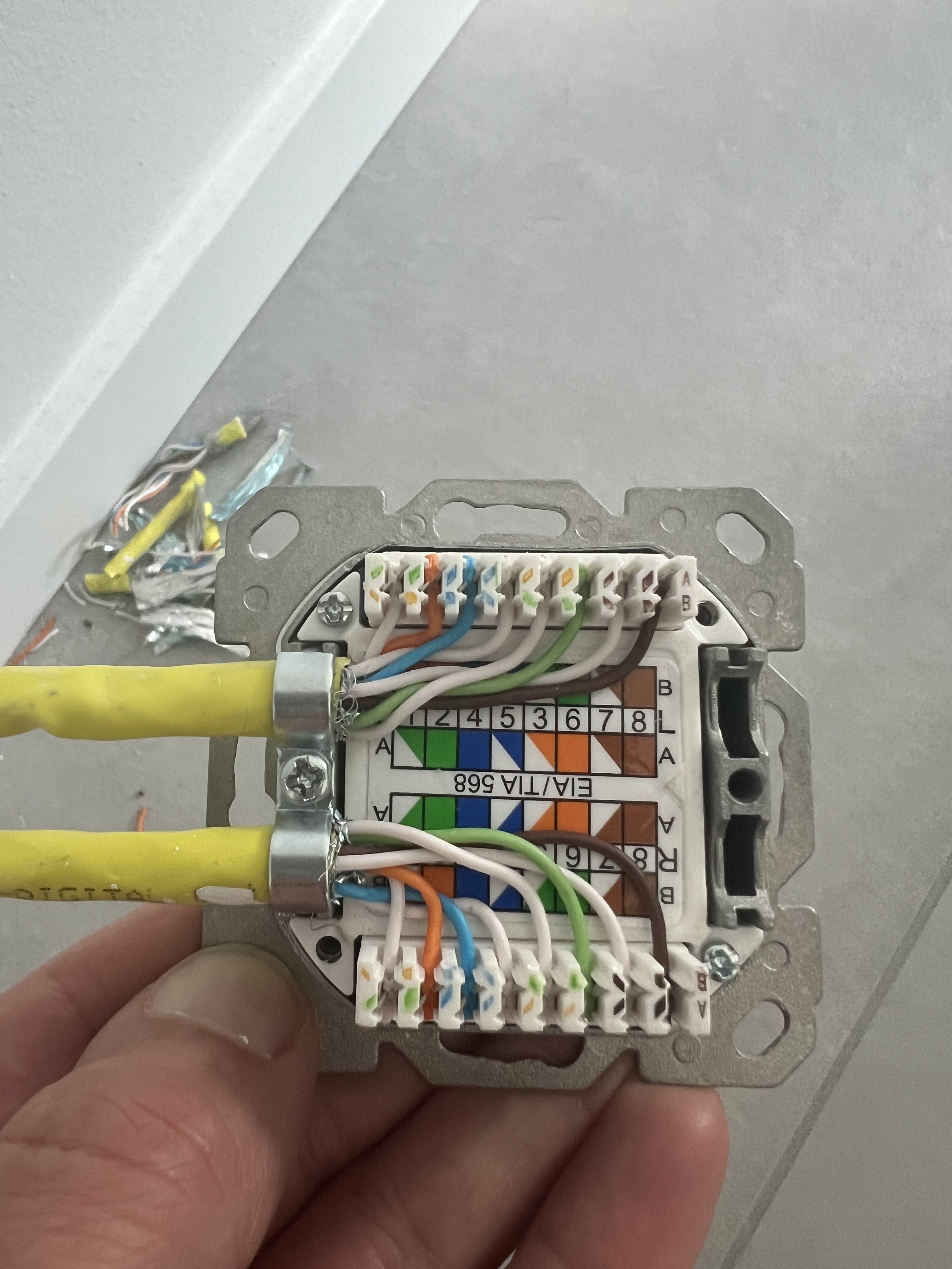 Ich habe 12 Kabel im Haus verlegt, diese sind alle in den Wänden versteckt und jeweils kommen pro Zimmer 2 aus der Wand. Diese habe ich auf eine Netzwerkdose gepacht und das andere Ende an einen RJ45 Stecker.