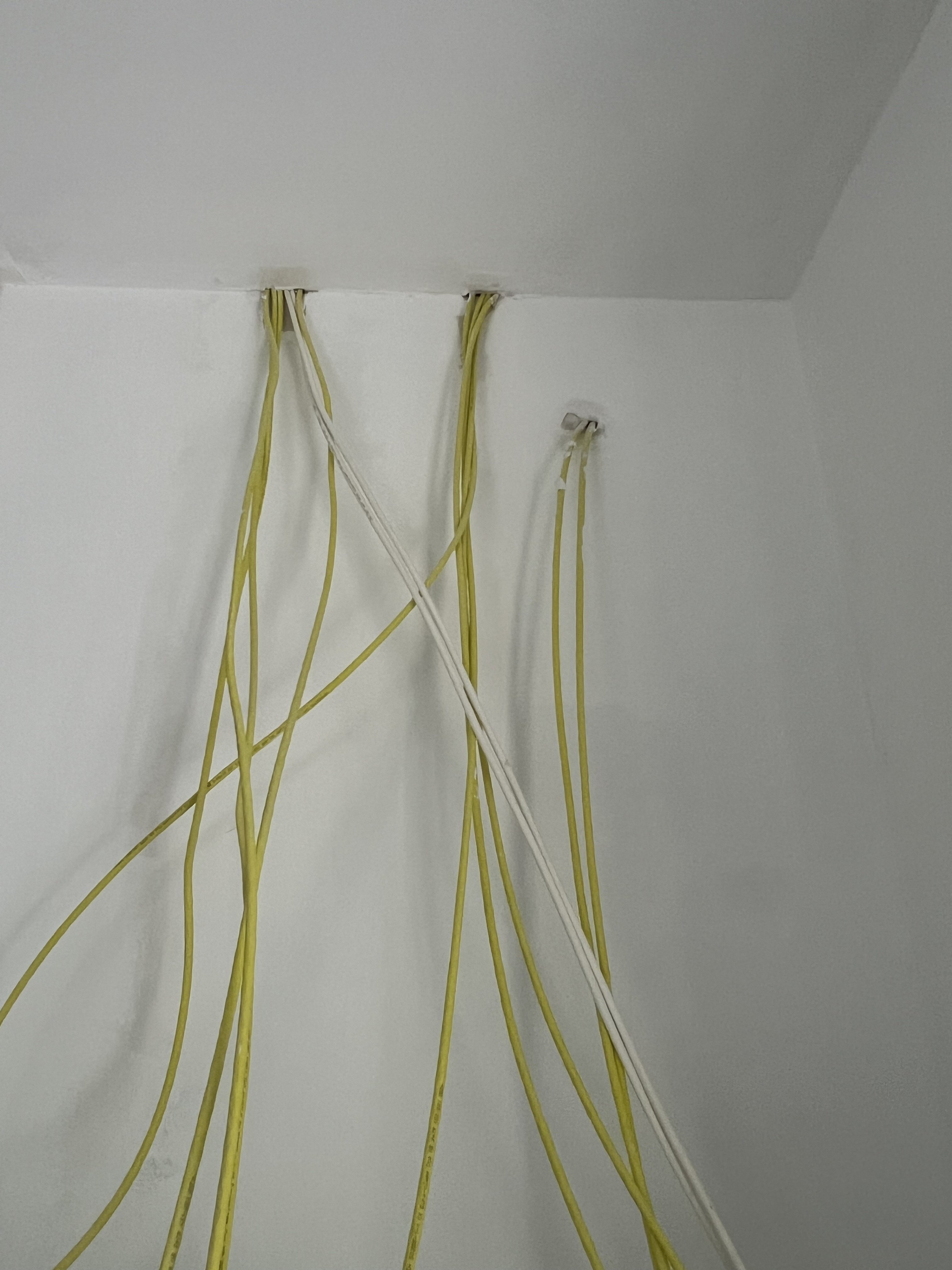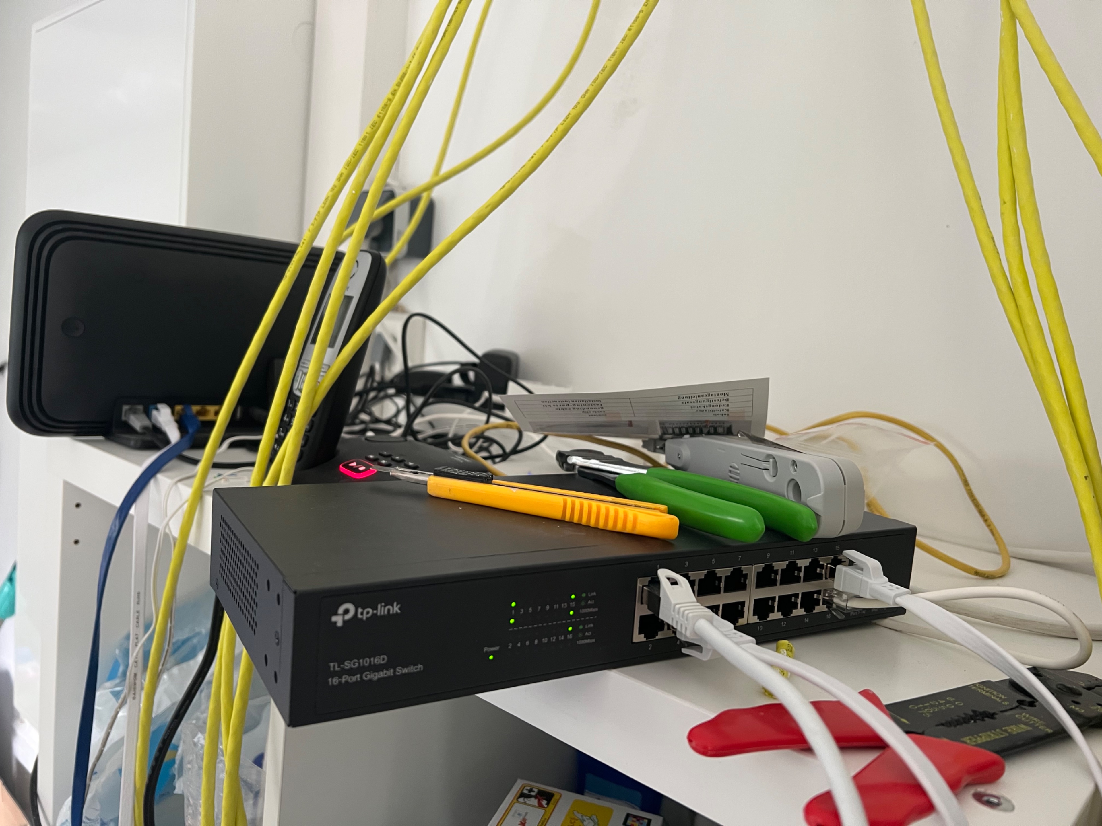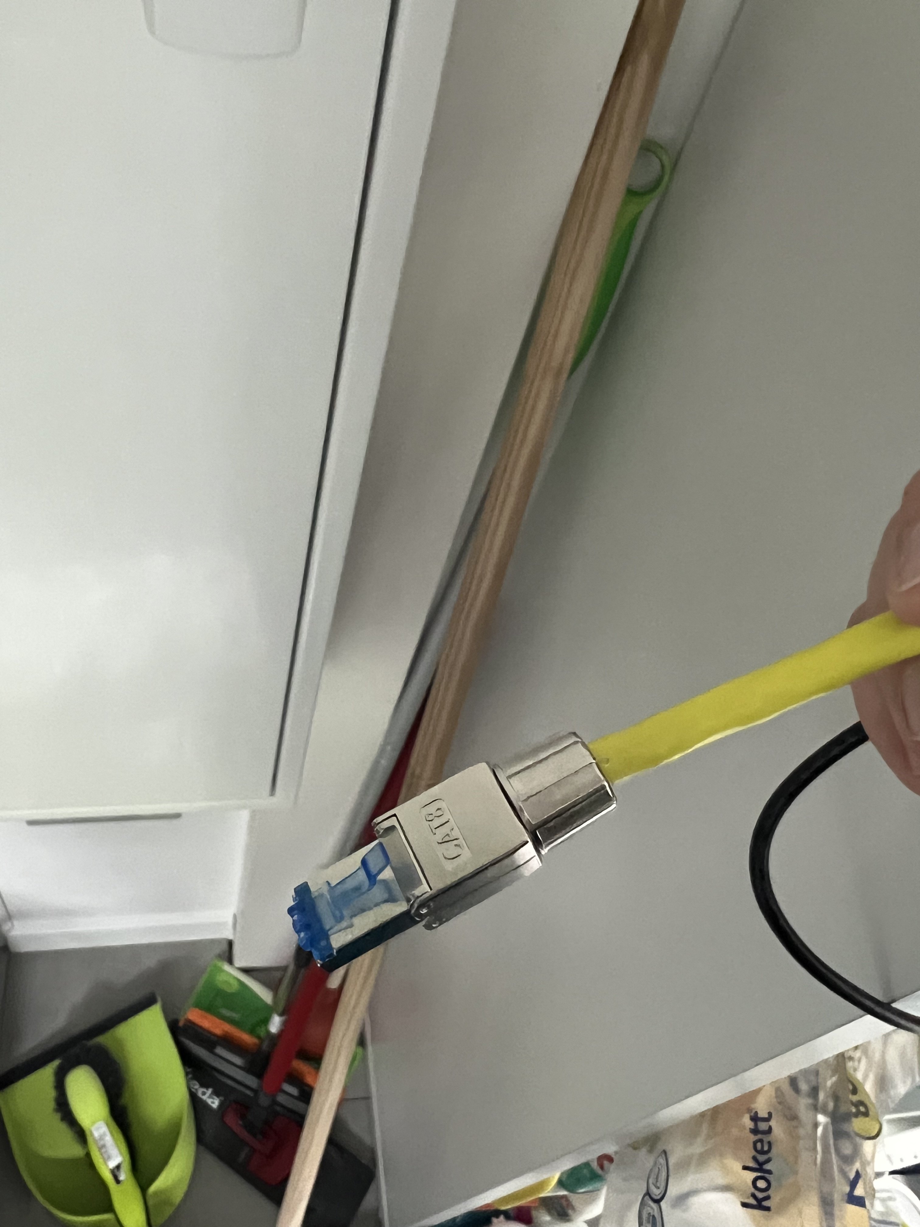 Ich habe 12 Kabel im Haus verlegt, diese sind alle in den Wänden versteckt und jeweils kommen pro Zimmer 2 aus der Wand. Diese habe ich auf eine Netzwerkdose gepacht und das andere Ende an einen RJ45 Stecker.