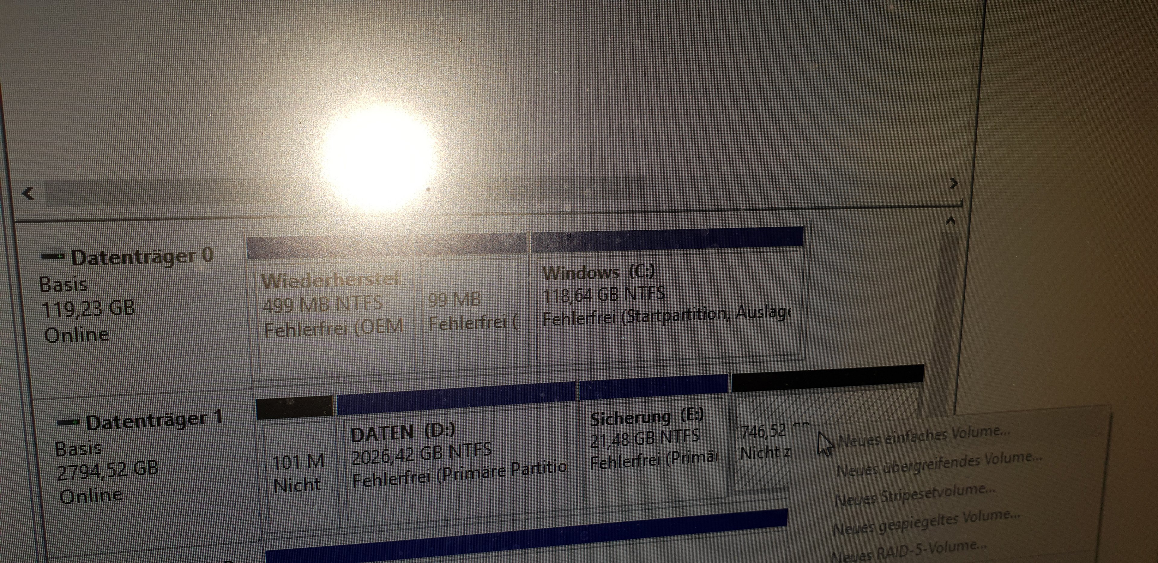 In der Datenträgerverwaltung werden mir auch noch knapp 750GB als nicht zugeordnet angezeigt, aber die kann ich keiner neuen Partition zuordnen.