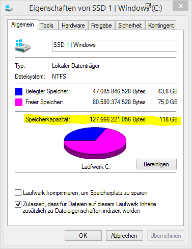 Hallo, ich habe meine 840 Pro die ich im Notebook eingebaut habe auf 100gb und 150gb formatiert, nur zeigt der Windows Explorer nur 99,9GB an, wieviel genau muss ich einstellen damit ich 100 angezeigt bekomme