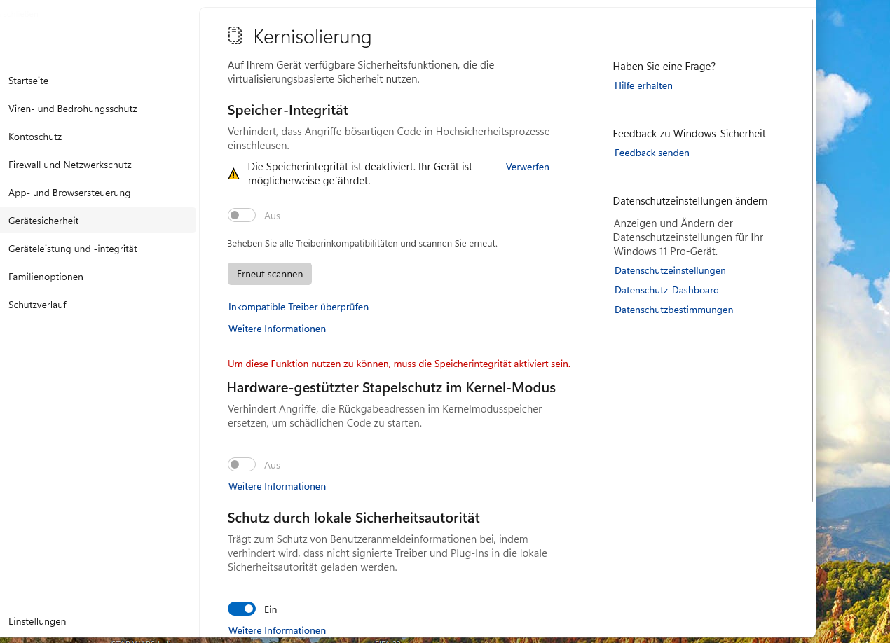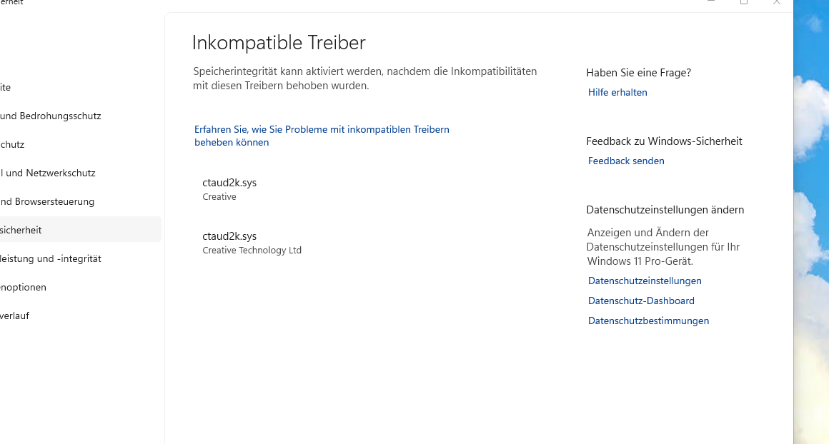 Ich möchte die Funktion Speicher-Integrität in Windows 11 aktivieren, ist aber nicht mögich weil es Treiberinkompatibiläten gibt.