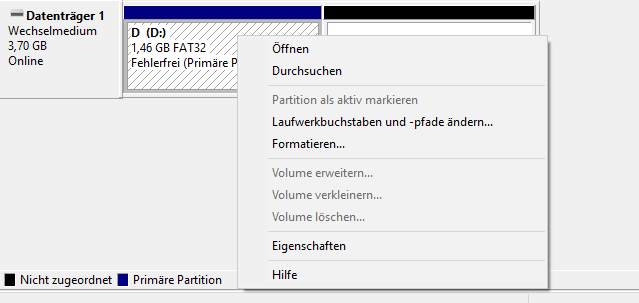 ranzassel schrieb:Die Windows-Datenträgerverwaltung will keine SD-Karten partitionieren, musst du manuell machen. Anleitung z.B. hier: http://www.forum-raspberrypi.de/Thread-sd-karte-auf-orginalzustand-bringen?pid=1676#pid1676.
