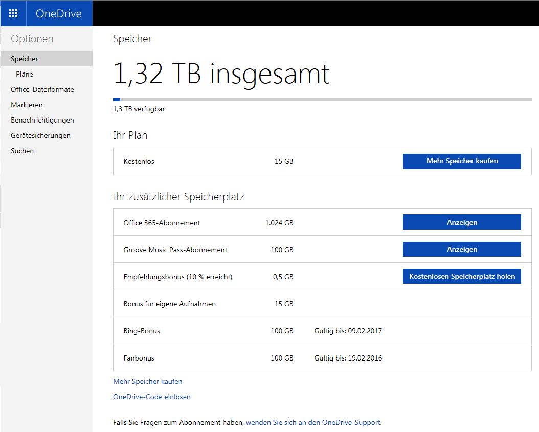 @über mir - 365 Abo (1TB), Groove-Abo (100MB), Bing-Bonus bis 2017 (100GB). 2016 ist mir schon klar, dennoch bin ich nicht direkt betroffen. 1TB reicht mir ja dicke. Die 5GB free, das geht eben gar nicht.