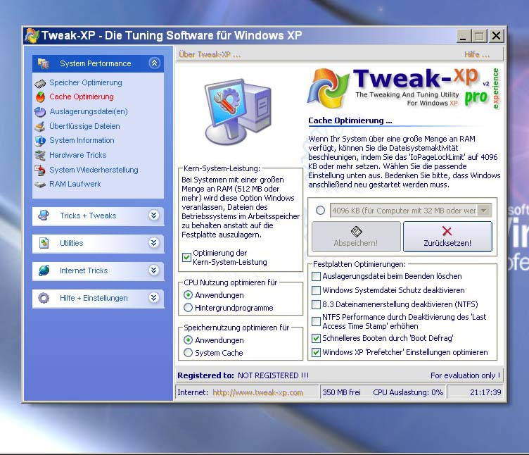 Wenn ich bei der "Speichernutzung" von standardmässig "PROGRAMME" auf "SYSTEMCACHE" ändere, zerschiesst sich XP auch irreparabel.