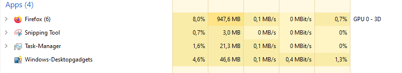 ich hätte gerne Euren Rat. Ich benutzte unter Windows 10 (1903) das 8GadgetPack in der aktuellen Version (31.0). Unter anderem lasse ich mir auch den Speicherverbrauch der einzelnen Apps anzeigen. Dabei fällt auf, dass der Speicherverbrauch der Sidebar stetig steigt. Nach frisch gestartetem System sind es ca. 200 MB, jetzt nach ca. 3 Stunden schon 1,4 GB. Ich hatte nach einem ganzen Tag auch schon mal über 5 GB RAM-Verbrauch gehabt. Wenn ich die Sidebar im Taskmanager beende und dann neu starte, beginnt es wieder bei ca. 200 MB. Ich verstehe nicht woran das liegen kann.