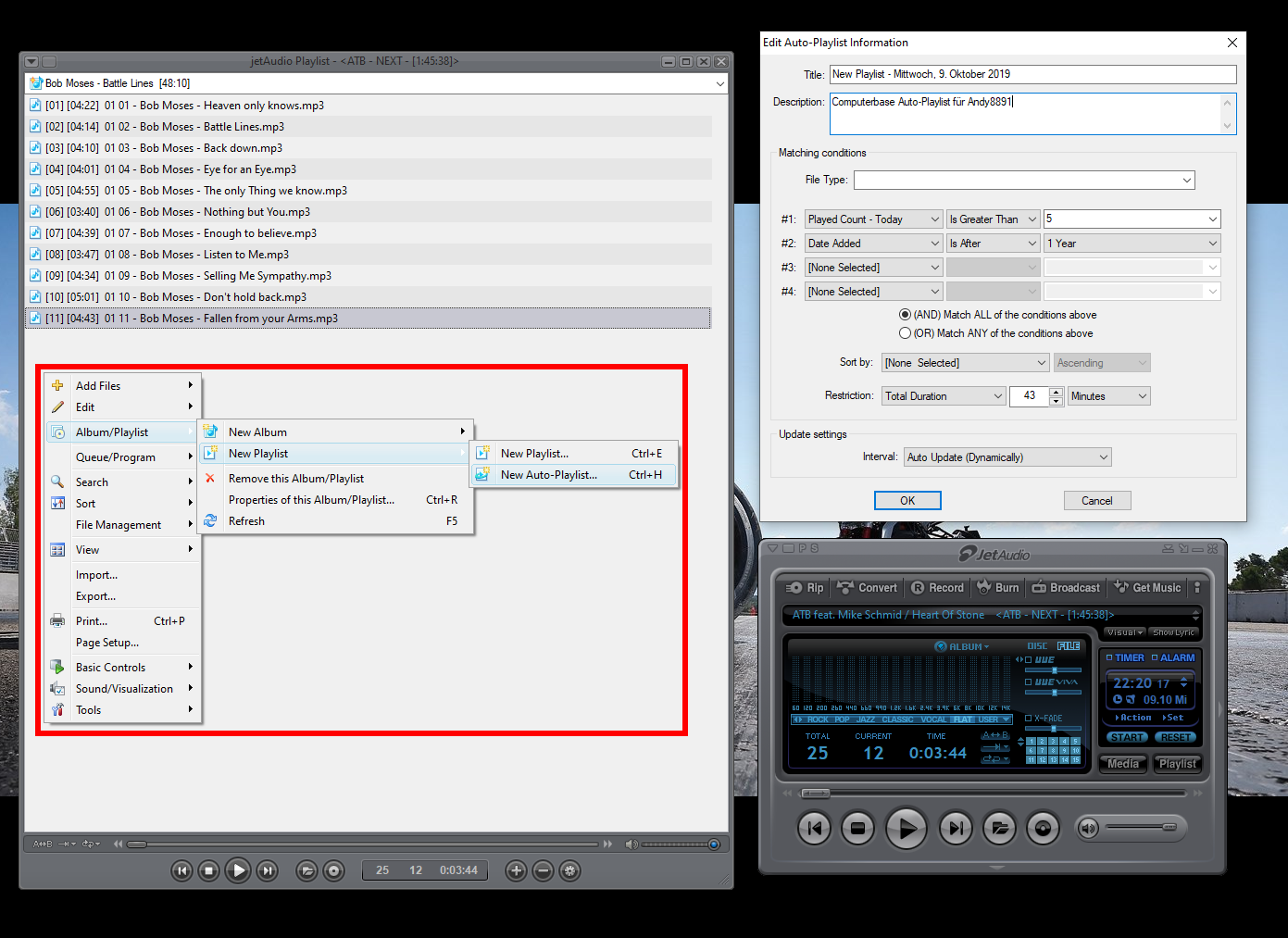 - In den 40 Minuten kommen die 3 Lieder 100% vor und 7 zufällige aus den restlichen 17.