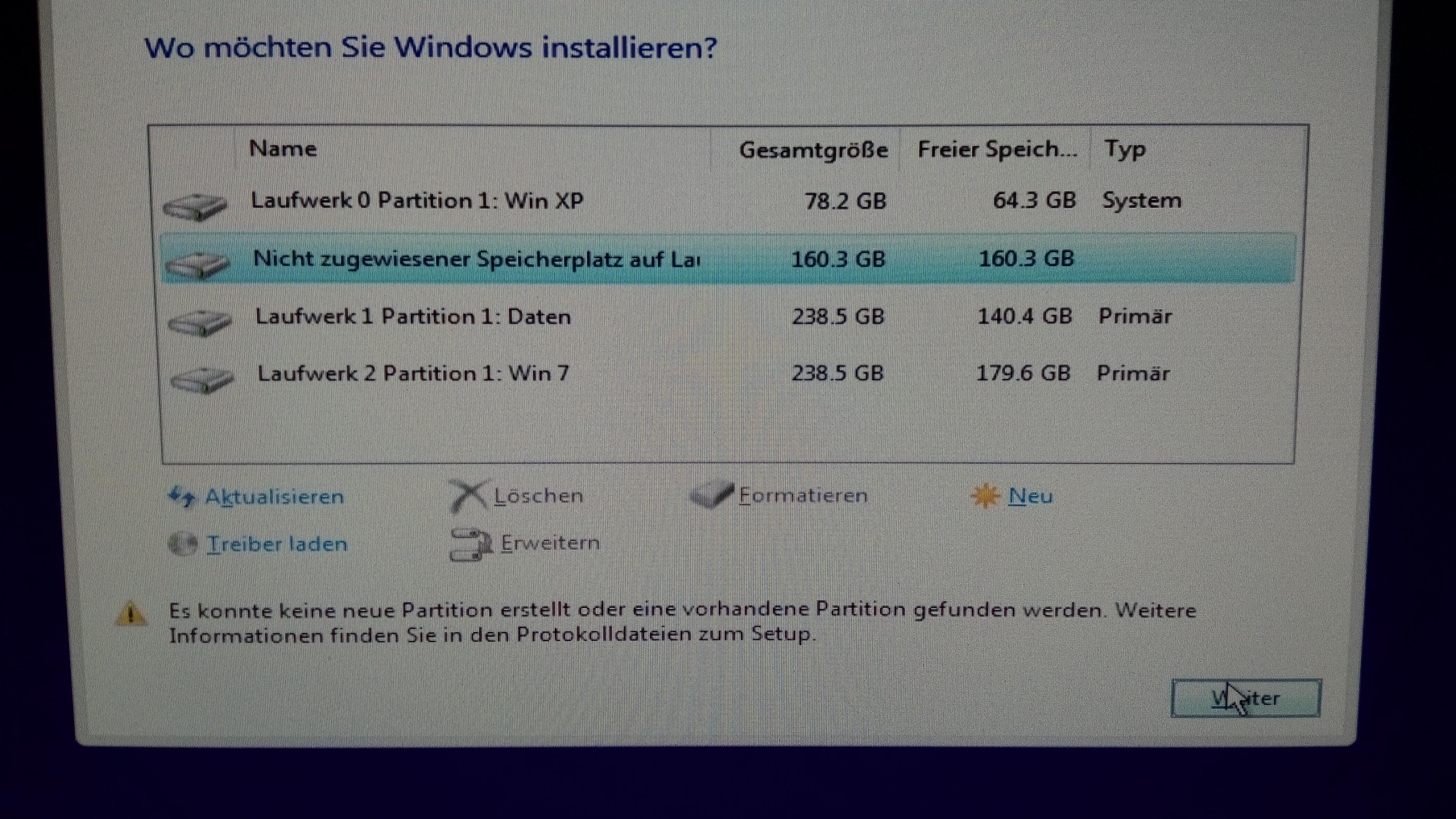 Doch als ich den Windows 10 Stick gebootet habe und den unzugeordneten Speicher für die Windows 10 - Installation ausgewählt habe, kam Folgendes: