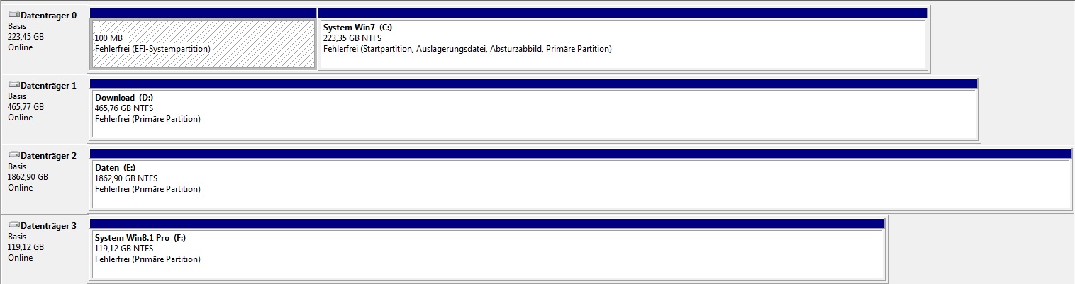 Die erste 830 habe ich gekauft und damals Windows XP drauf installiert. Eine Partition. Dann habe ich noch eine 830 eingebaut und diese zu meiner Datenplatte gemacht, auch nur eine Partition. Dann habe ich noch eine 840 Pro eingebaut und darauf Win 7 installiert, auch auf einer Partition. Das alles mit dem MBR. Windows 7 hat wie es aussieht auch den Bootmanager auf der Win XP SSD - installiert.