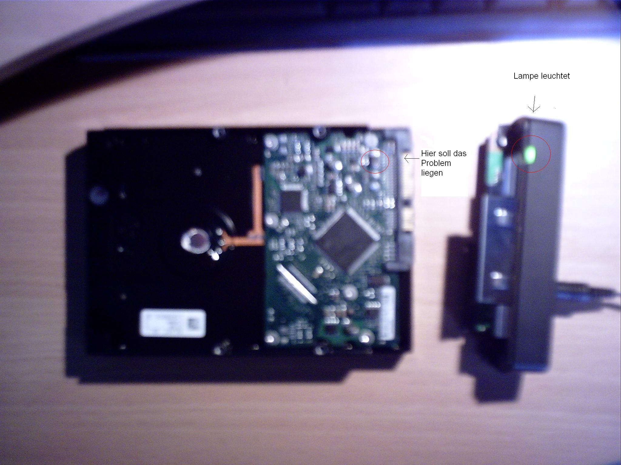 Ich hoffe, Ihr könnt mir helfen. Ich habe folgendes Problem. Mein Bruder hat meine 500 GB Festplatte mit einem falschen Netzteil in die Steckdose gesteckt. Seitdem ist nicht mehr viel los mit dem Teil. Eigentlich gar nichts. Ich dachte, es wäre eine Überspannung ( wenn es das gibt ). Also habe ich es zu meinem Chef gebracht, der irgendwas mit Elektronik studiert hat. Der hat das Gehäuse abgenommen und das Ding geprüft, wo der Stecker von der Steckdose reinkommt. Das funktionierte. Er sagte dann, das Problem liegt auf der Platine. Nur hat er leider keine Ahnung von Computern und Festplatten. Er konnte mir also nur bis zu diesem Punkt weiterhelfen. Und jetzt kommt Ihr ins Spiel. Wie komme ich an die Daten wieder ran? Ich hab mal Fotos gemacht, für das bessere Verständnis meiner laienhaften Ausdrucksweise.