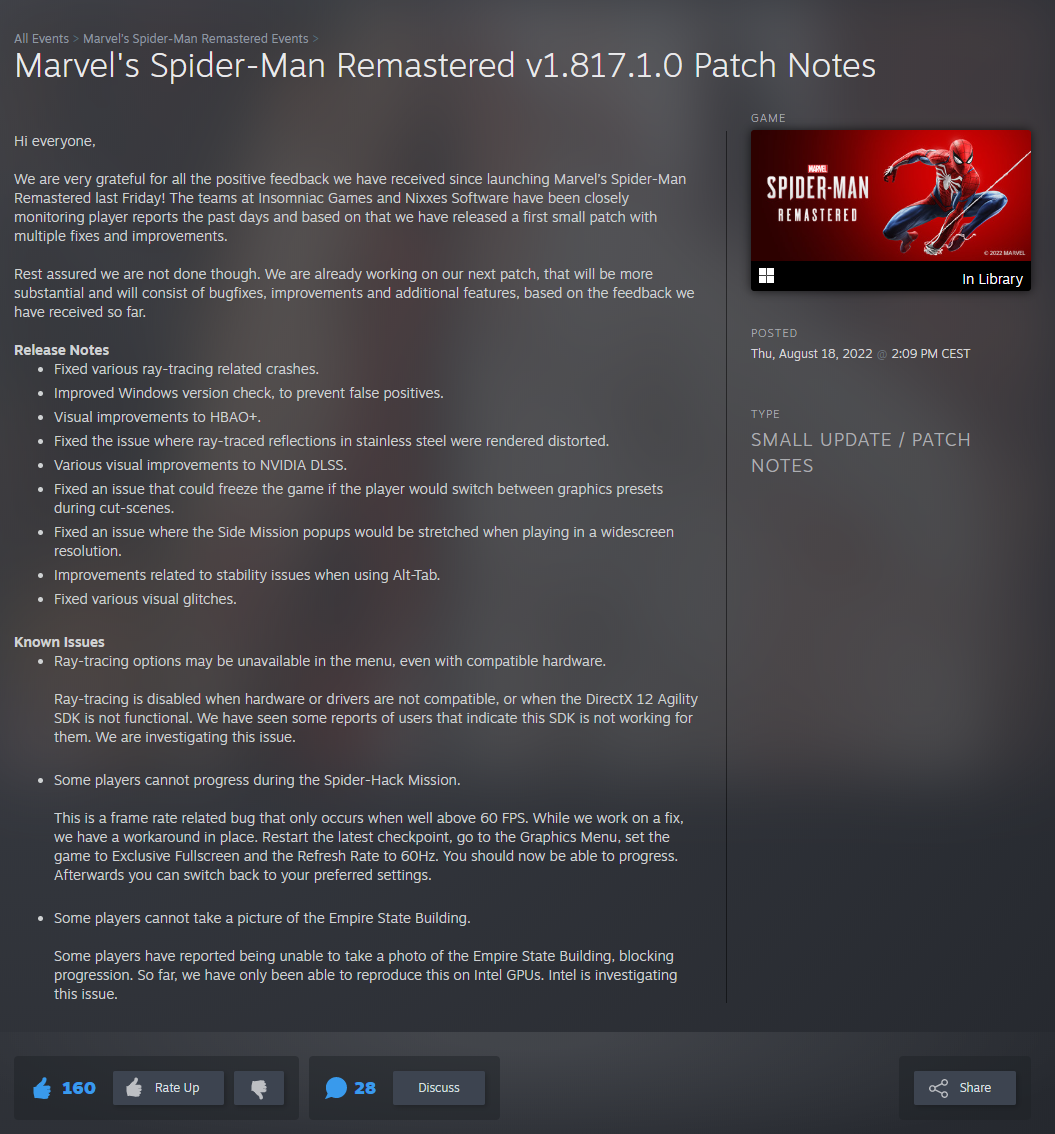 Artikel-Update: Sony hat Patch v1.817.1.0 für Spider-Man Remastered veröffentlicht. Laut den Patch Release Notes auf Steam sollen diverse Qualitätsprobleme bei der Nutzung von Nvidia DLSS, HBAO+ und Raytracing behoben worden sein, auch die Stabilität soll nun besser ausfallen.