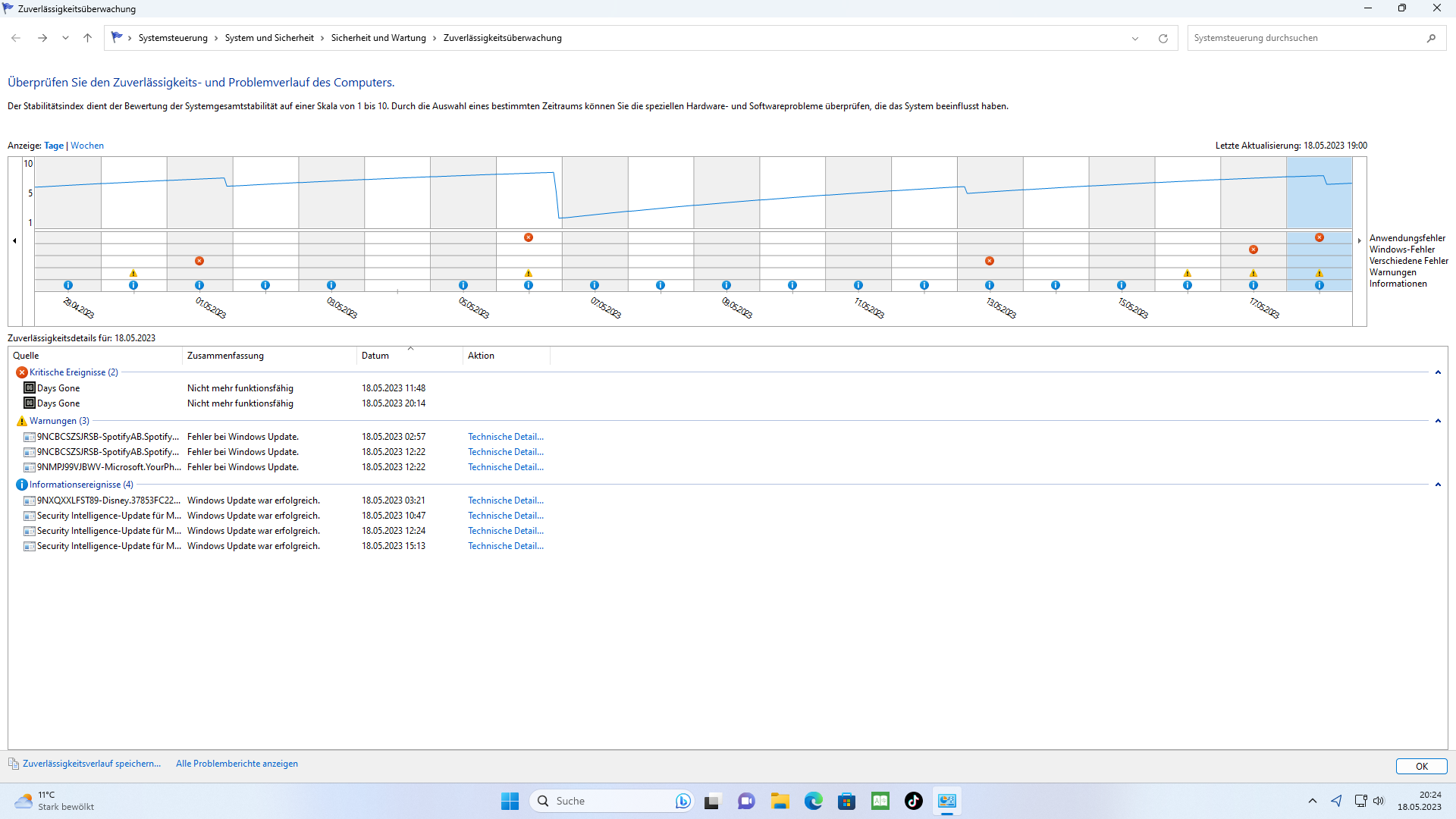 2. Beschreibe dein Problem. Je genauer und besser du dein Problem beschreibst, desto besser kann dir geholfen werden (zusätzliche Bilder könnten z. B. hilfreich sein):Ich spiele seit Heute Days gone. Das Spiel läuft ganz normal ohne irgendwelche Auffälligkeiten. Nachdem ich das Spiel beendet habe auch ohne Probleme steht im Zuverlässigkeitsverlauf Spiel nicht mehr funktionsfähig. Hat jemand ne Idee was der Fehler ist.