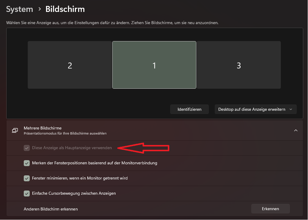 Der Hauptmonitor wird aber mit der Nr. 2 bei den Anzeigeeinstellungen angezeigt. Ich könnte mir vorstellen das es damit zusammenhängt. Wie kann ich dies ändern?