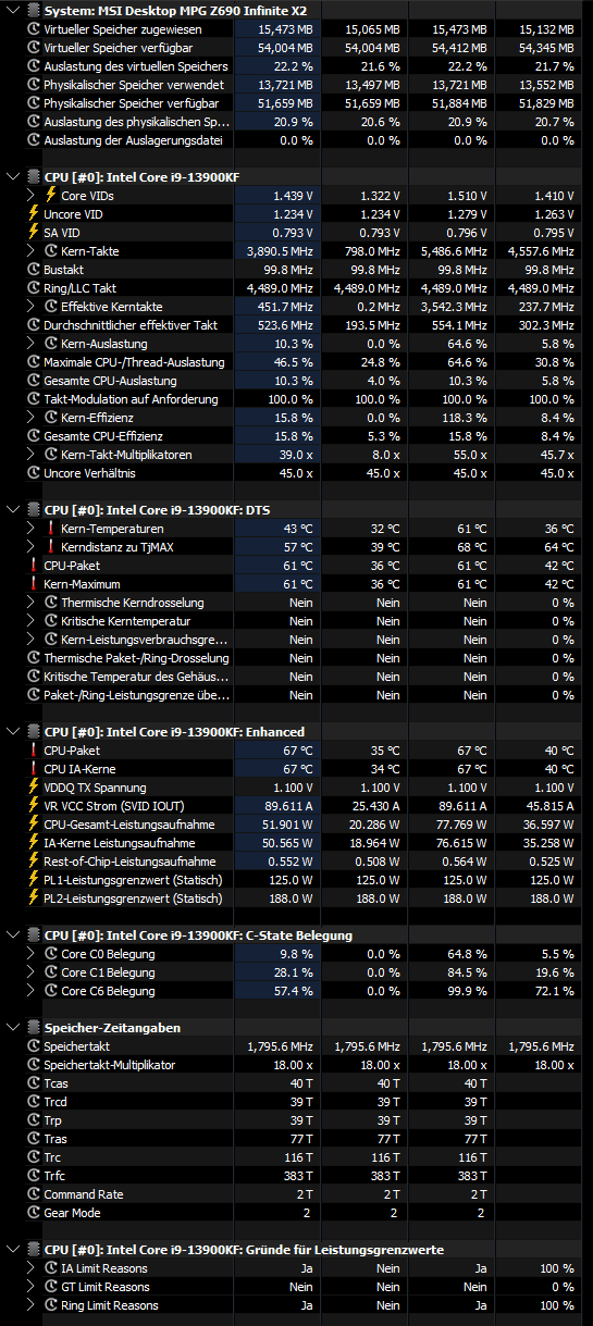 Prozessor: 13th Gen Intel(R) Core(TM) i9-13900KF, 3000 MHz, 24 Kern(e), 32 logische(r) Prozessor(en)