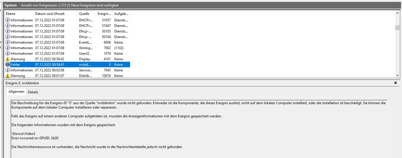 Anspruchsvolle Spiele (RDR2, 7Days to die) stürzen nach einigen bis wenigen Minuten ab. Manchmal auch erst nach einer halben Stunde oder einer Stunde. In der Ereignisanzeige findet sich dann immer einer von den beiden Fehlern, die ich im Anhang gepostet habe. Ältere Spiele (zB Helldivers, Left4Dead2) und 2D Games laufen problemlos. Abseits von Spielen habe ich bis jetzt keine ähnlichen Probleme festgestellt.