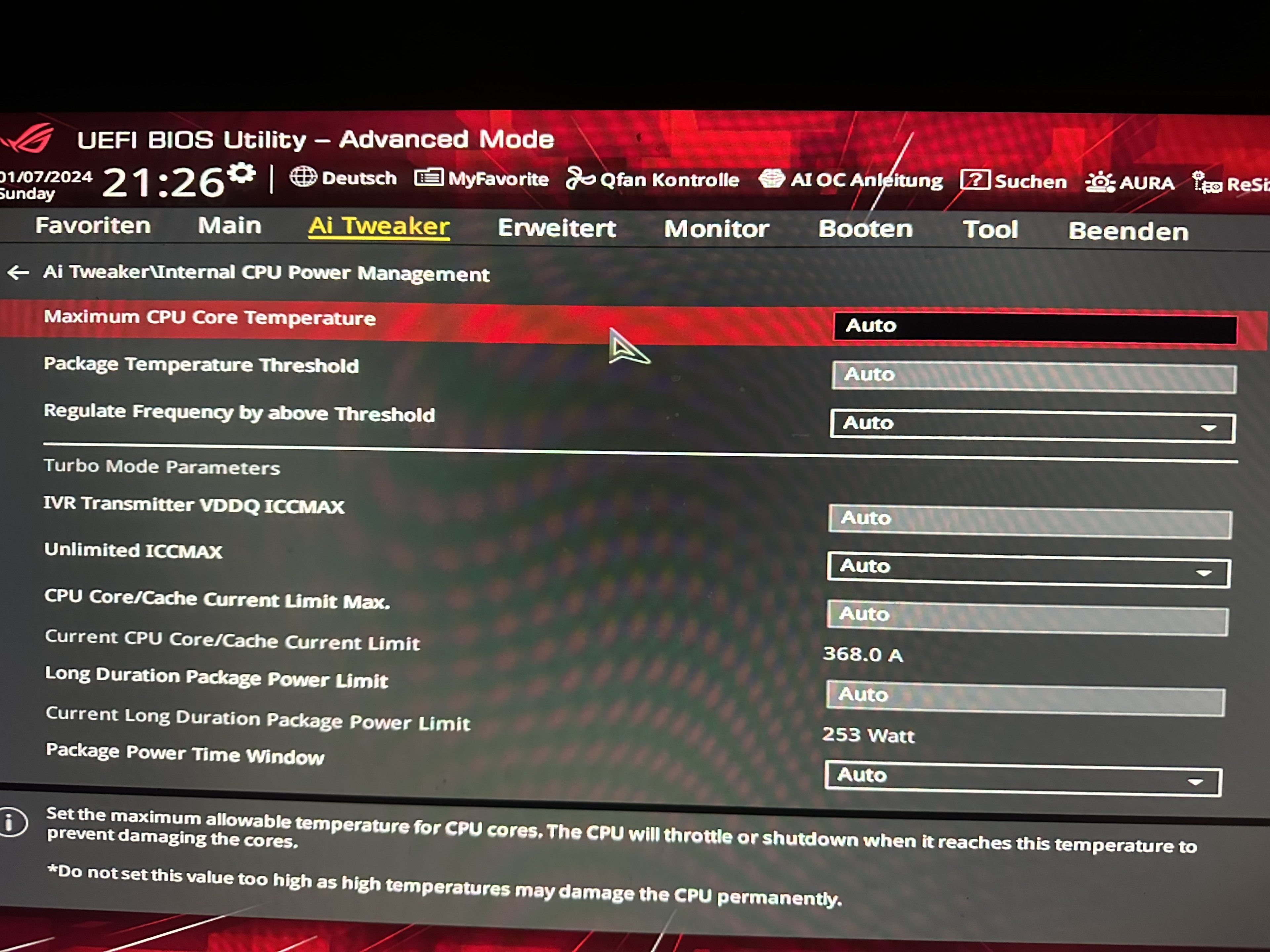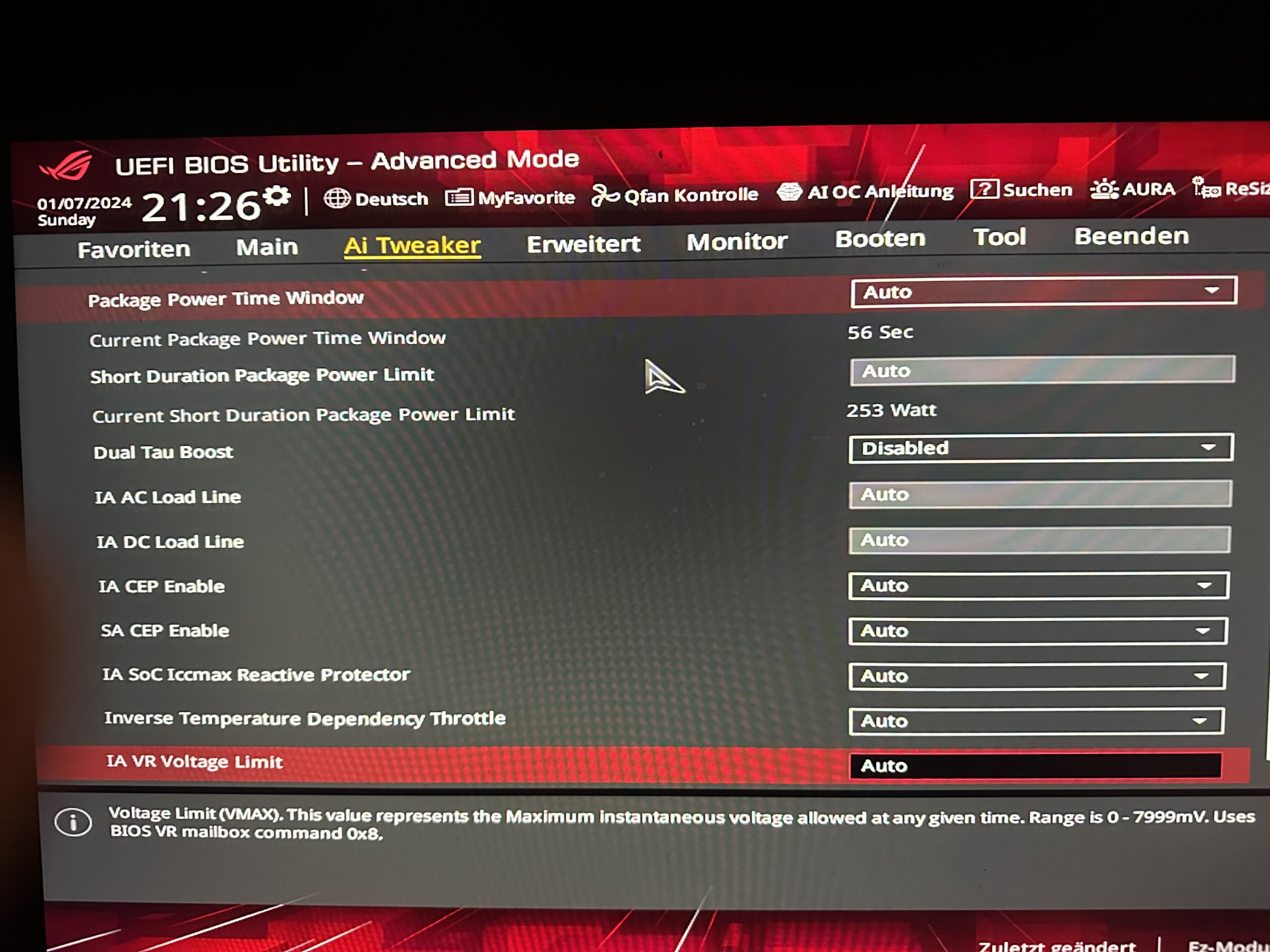 Das habe ich im Bios gesucht aber nicht gefunden, heißt das bei RoG vielleicht anders?goodnight schrieb:Ist die CPU nicht auf 125W PL1 spezifiziert? Vielleicht verträgt er ja die 253W auf Dauer im konkreten Fall nicht. Ohne MCE im Bios(siehe Hinweis im screenshot vom Startbildschirm nach dem Biosupdate) sollte ja an sich nach 56 sec auf 125W gedrosselt werden.