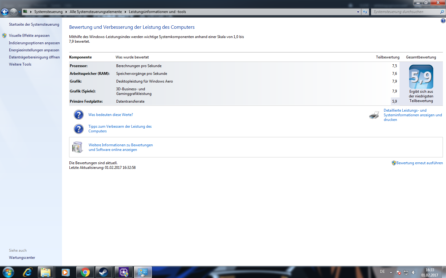 Windows Taste + Pause Taste -> erneut den LEISTUNGSINDEX erstellen.