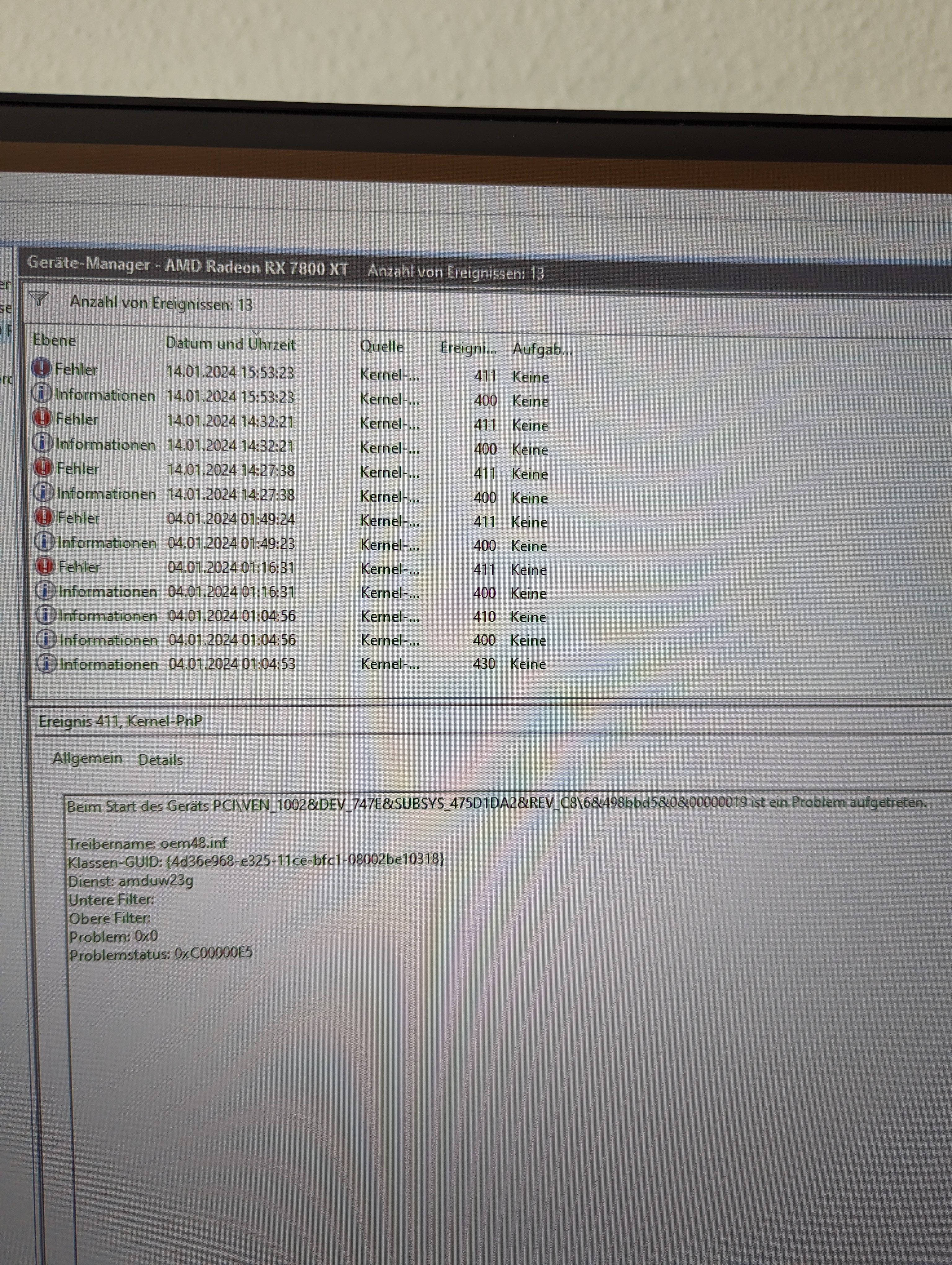 Wenn ich im Geräte-Manager die Ereignisse der GPU Aufrufe gibt es dort mehrere Meldungen dass beim Start der GPU ein Problem aufgetreten ist bzw sie nicht gestartet wurde (siehe Bilder)