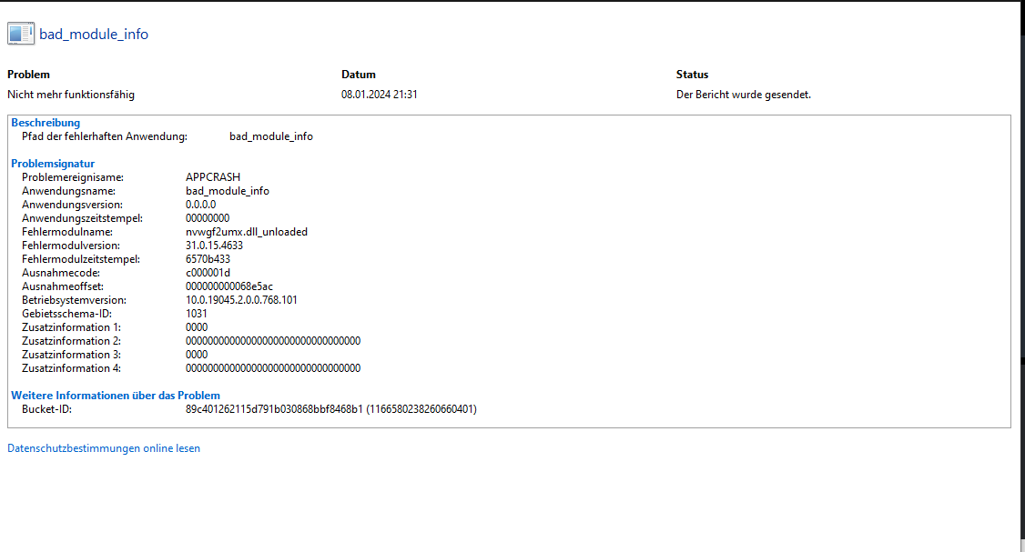 Im Anhand noch ein Paar Screenshots vom Zuverlässigkeitsverzeichnis, von der Ereignisanzeige und ein paar crash Infos.