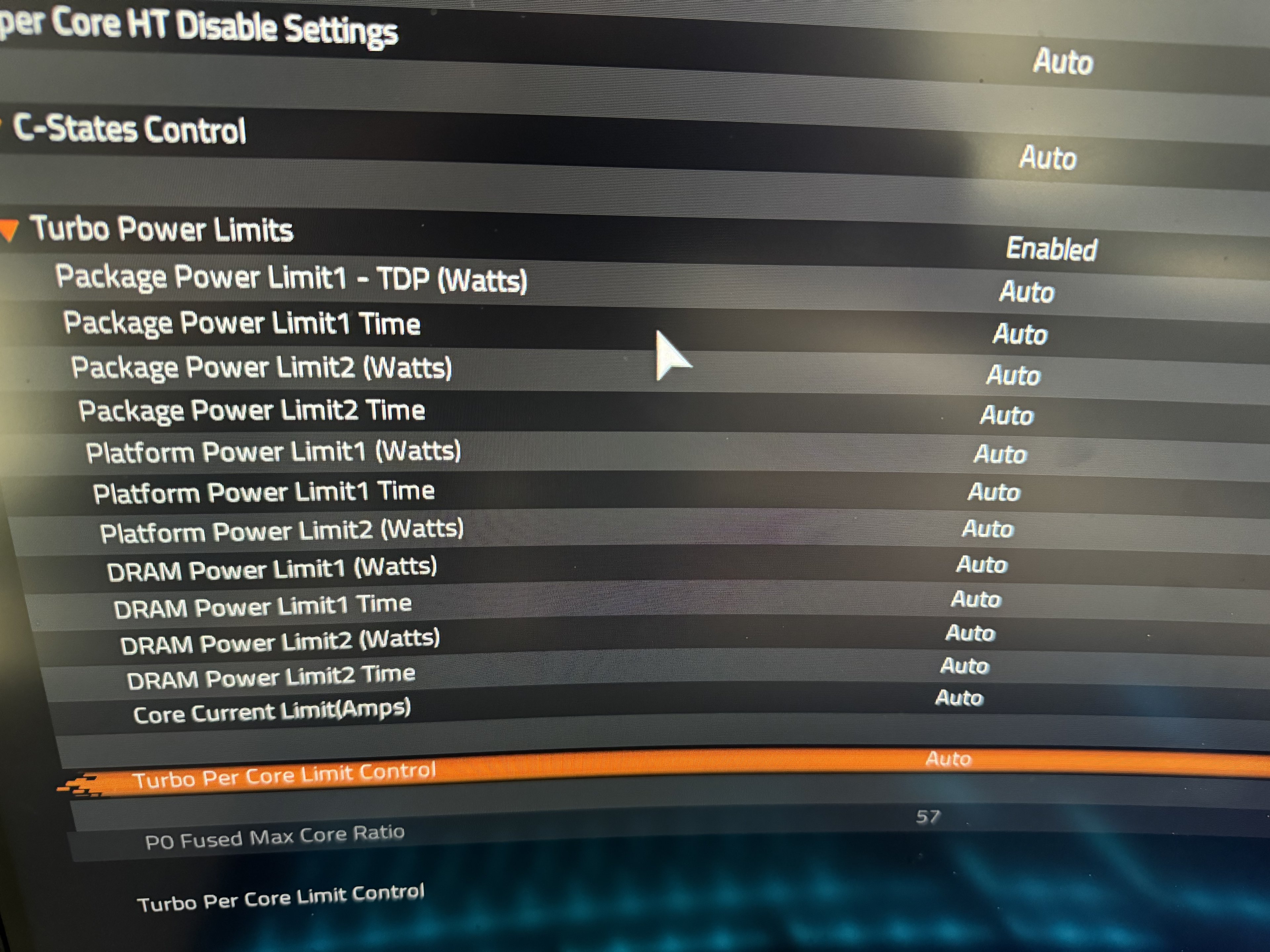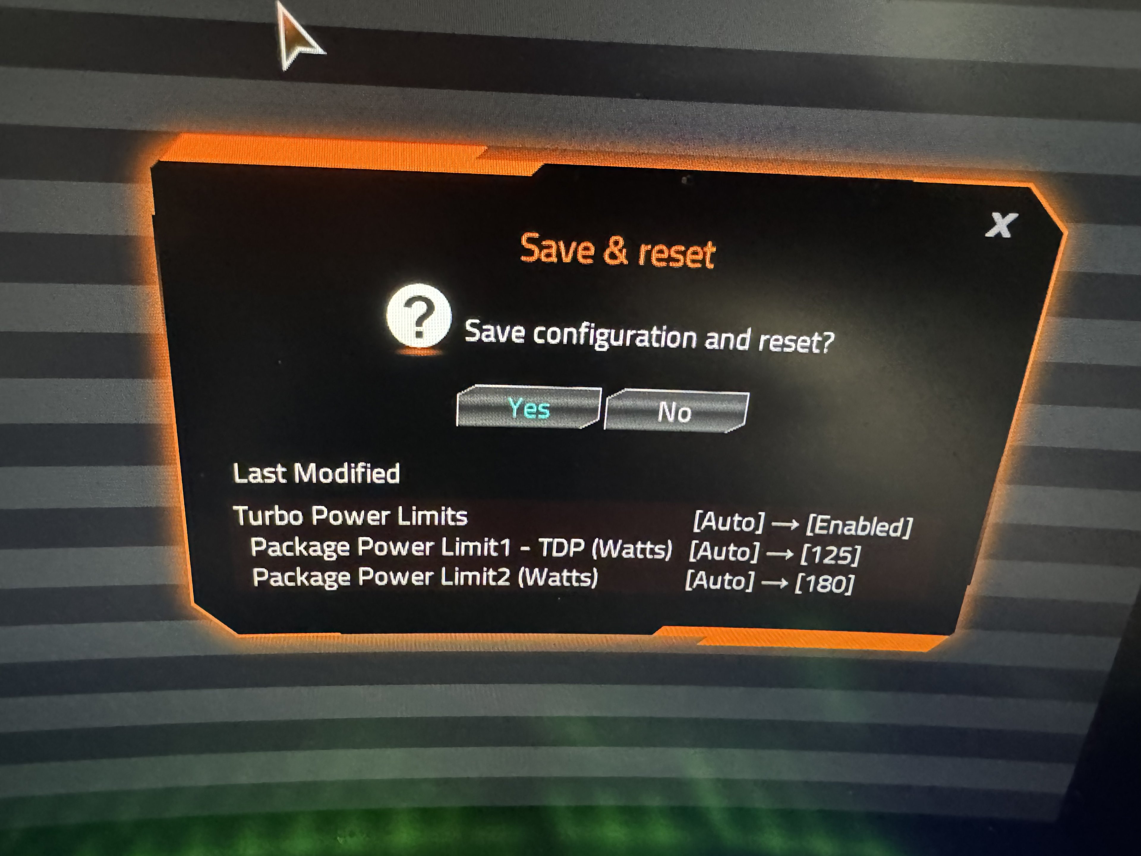 Im Gigabyte Bios findet man das unter TWEAKER -> Power Limits -> Intel POR oder manuell auf PL1 150W und PL2 auf 253W und weiter unten wo CURRENT LIMIT steht die 307 (Amps oder in Neodjörmänn auch Ampere genannt) auswählen.nonou schrieb:Dann nimm mal deine Begrenzung raus und teste ihn mal bitte Stock.