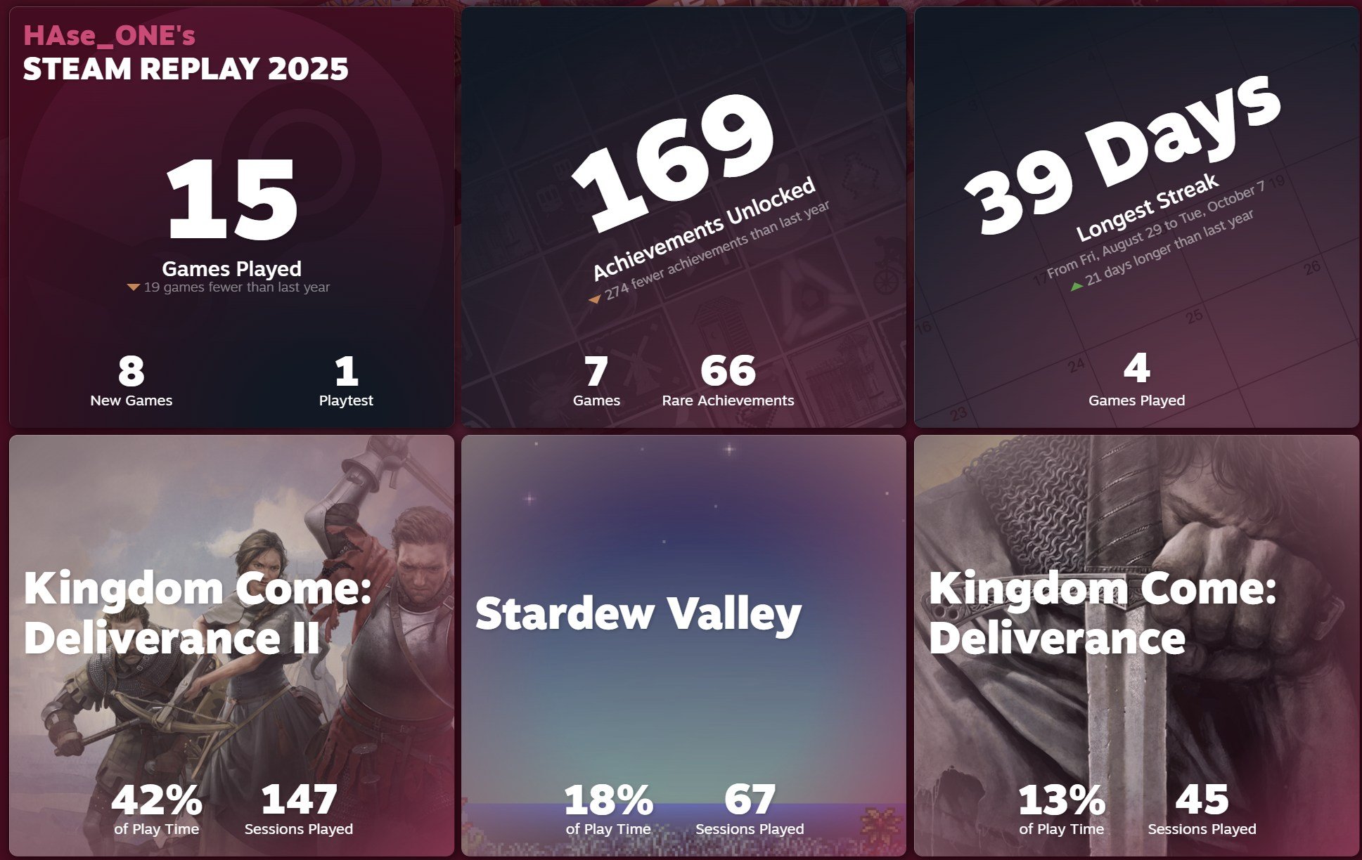 Mein Steam Replay sieht auch lustig aus xD. Seit April ist bei mir da jeden Monat KCD drin außer November, da hab ich mal ne Pause gemacht