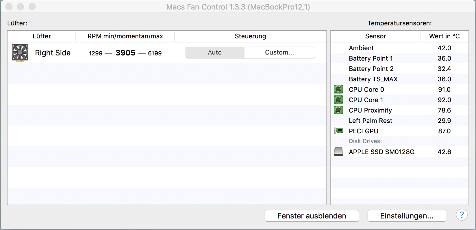 Laut Spezifikationen von Intel ist der Prozessor (Core i5 5257U) auf maximal 105 °C ausgelegt, und darunter bleibe ich beim Spielen auch -- die CPU-Temperatur liegt bei gut 90 °C (siehe auch den Screenshot). Trotzdem mein Frage an erfahrene MacBook-Nutzer und -Spieler: Leidet das Gerät auf Dauer, wenn man es länger bei solchen Temperaturen laufen lässt? Zumal ja momentan auch die Umgebungstemperatur sehr günstig ist; im Sommer wird das nochmal ganz anders ausschauen ...
