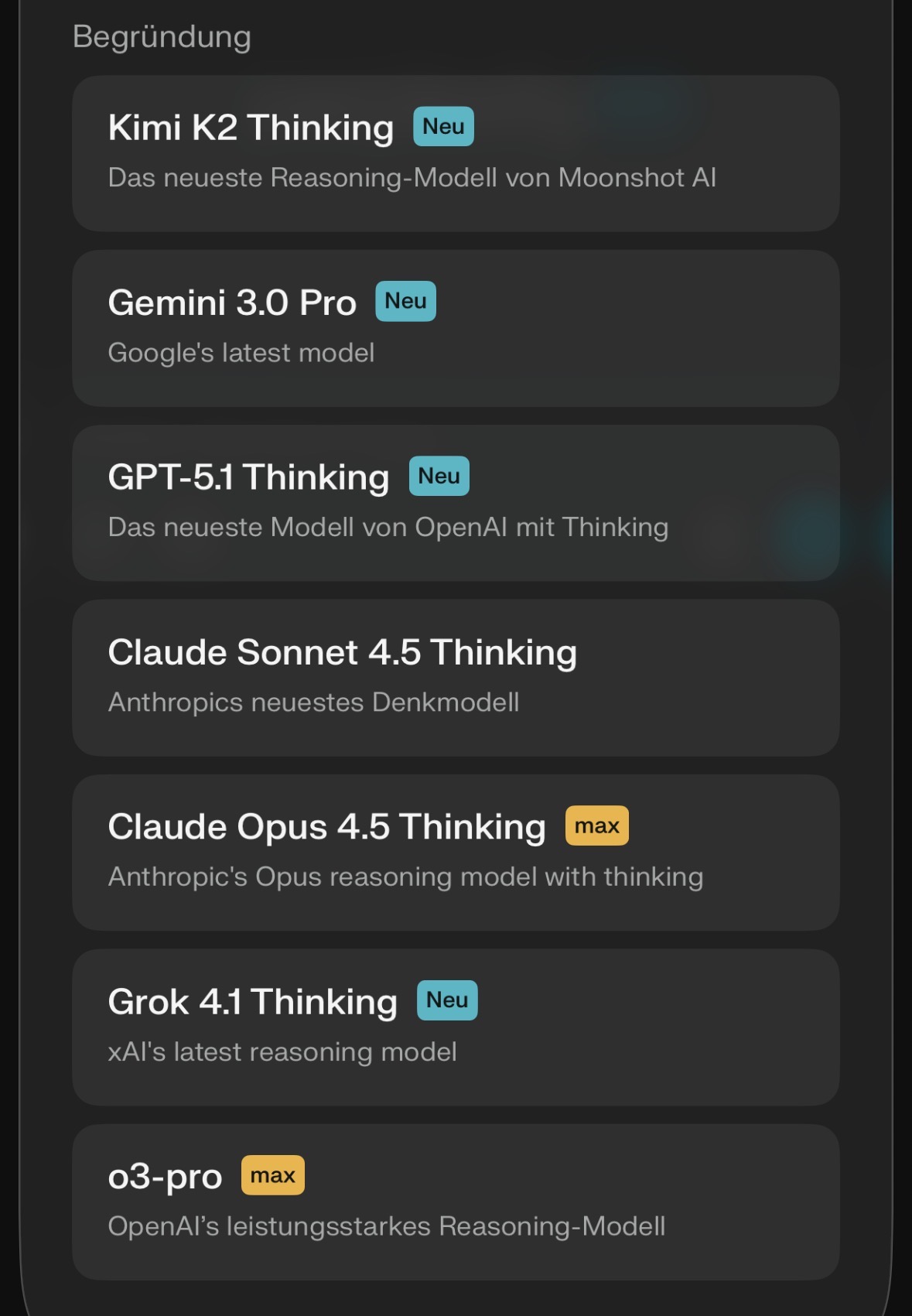 Mit https://abacus.ai/ , kannst immer auf alle Modelle zugreifen, die es aktuell so gibt für 10$ im Monat. Die Credits reichen meistens aus für einen Monat. Jede Anfrage verbraucht eine gewisse Anzahl Credits, bei den Antworten, steht das dabei. Besser als bei einem Anbieter zu sein. Ist die Antwort nicht gut genug, lass die Antwort nochmals von einem anderen LLM beantworten.