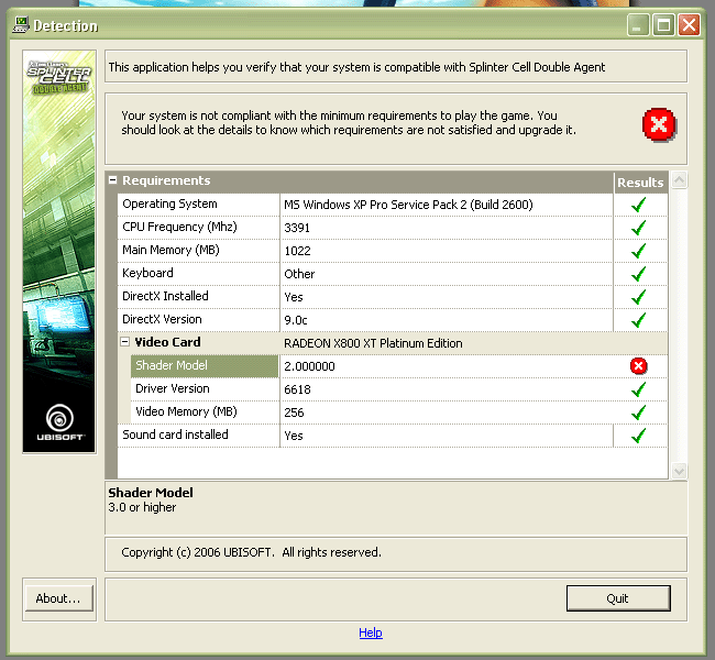 Der Unterschied ist nur, dass das Spiel nicht deshalb SM3.0 only ist, weil UBISOFT neueste Technik ausnutzen will, sondern weil man einen lupenreinen XBox360 Port genommen hat und zu faul war, überhaupt eine PC Anpassung vorzunehmen. Jeder anständige Publsiher lässt einen Fallback Modus in seine Spiele integrieren. Immerhin ist man weiter fortgeschritten als EA, die auch schon mal die Padtasten von der PS2 am PC einblenden.Leon schrieb:Ha ha. Ich kann mich noch an die groß geführten Diskussionen hier im Forum erinnern.