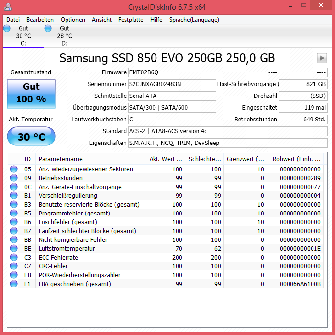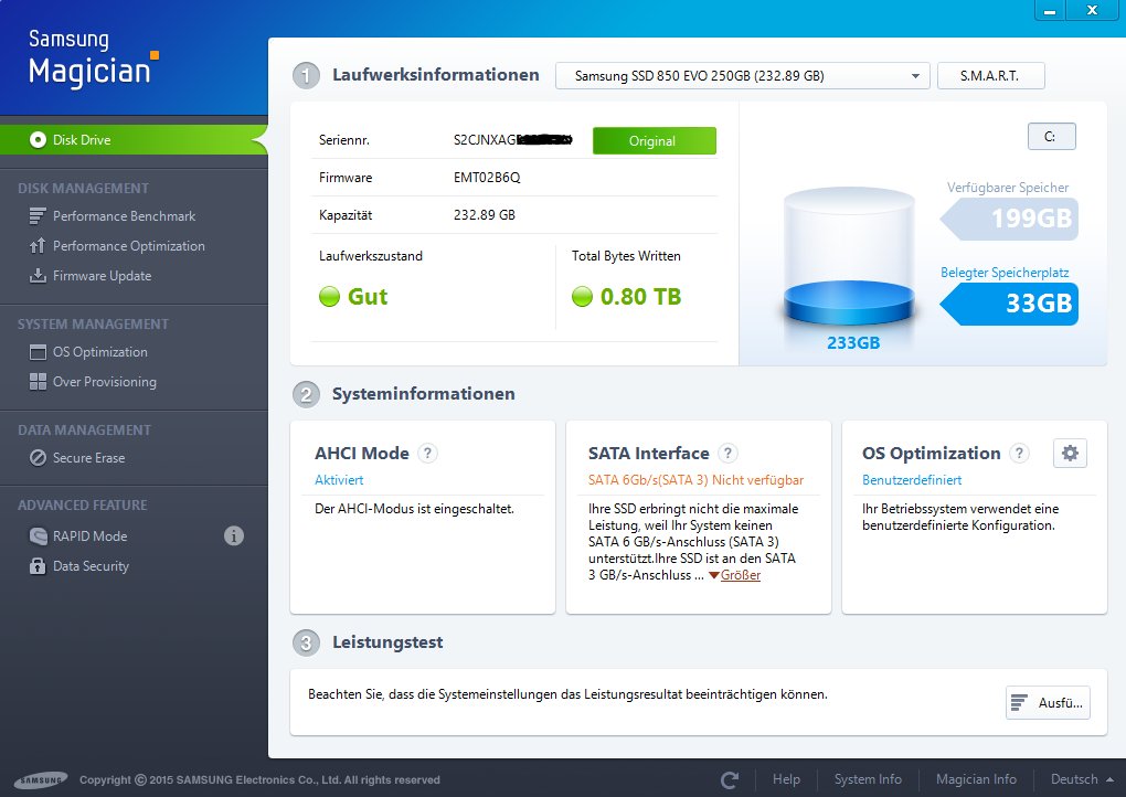 Ich habe noch zwei Screenshots von Samsung Magician entnommen. Hoffe, dass das erstmal die hilfreichsten Daten sind.