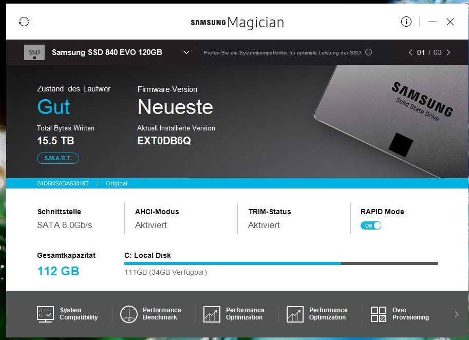 (Samsung Magican / AHCI: aktiviert / Trimm: aktiviert / Rapid Mode: aktiviert)