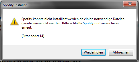 Wenn ich Spotify öffne erscheint nach einiger Zeit ein Fenster, dass Spotify "installiert" wird. Nach ungefähr 10 Sekunden erhalte ich folgende Fehlermeldung.