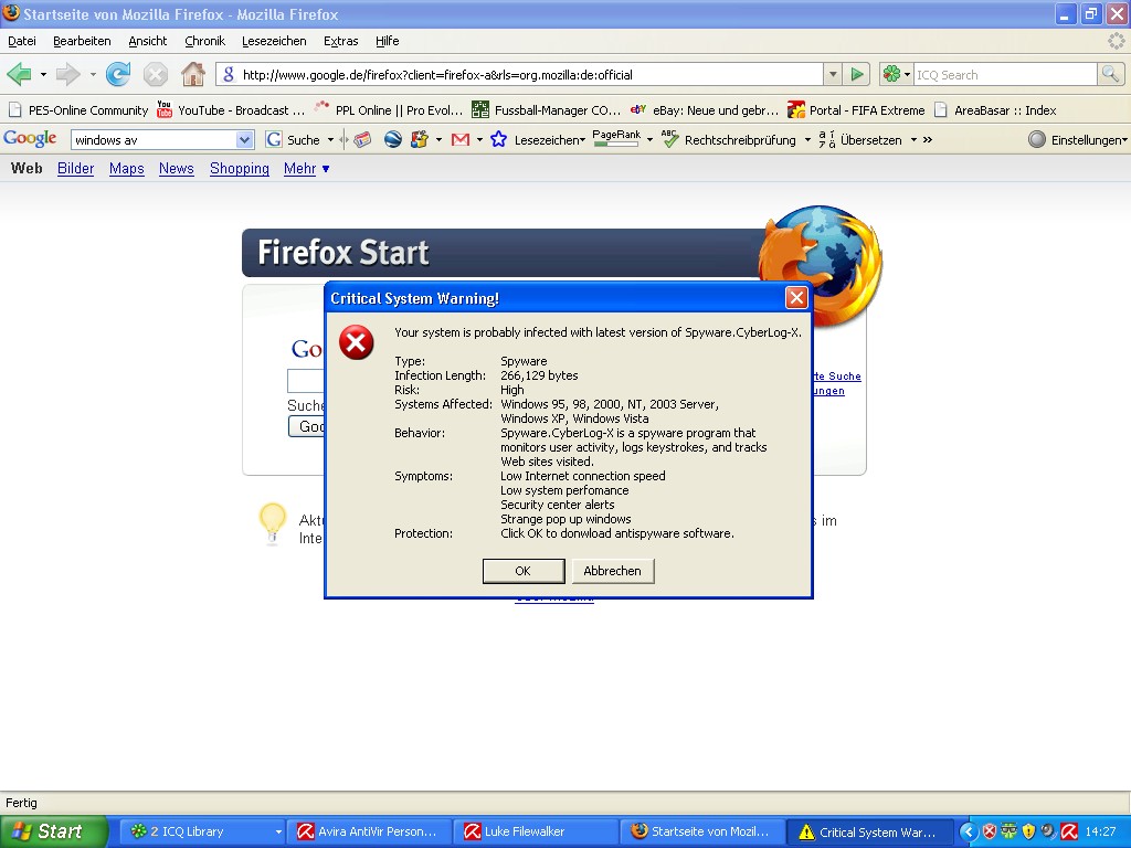 Ich habe einen Virus, Spyware oder sowas auf dem PC. Mit AntiVir hab ich was gelöscht aber es immer diese Meldung. AUf dem Sreens rechts unten das X und das ?. Was soll ich jetzt machen?