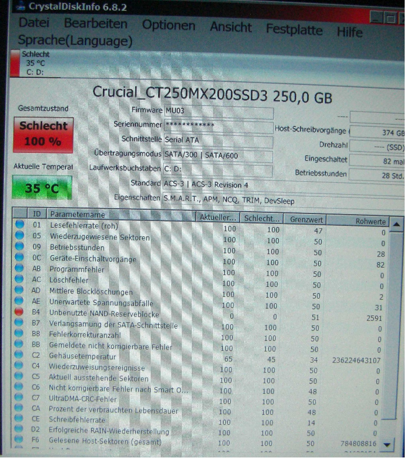 hier läuft jetzt seit einer Woche ne brandneue SSD als BS (W7 SP1, 64 Bit), mit 2 Partitionen, von einer MSATA 160 GB 1,8" HDD rübergeklont, und CrystalDisk zeigt plötzlich Fehler ohne Ende an! Was stimmt da nicht? Startet man CrysDisk neu, zeigt sie erstmal 'alles gut' an, aber nach kurzer Zeit, kommt plötzlich wieder Warnung. Beendet man CD und startet wieder neu, ist alles wieder gut. Nach paar wiederholten neu-Einlesungen kommt dann wieder Fehlermeldung.... Hat die neue Platte mit dem geklonten alten BS auch deren alte Fehler geerbt? Das alte BS auf der alten HDD (1,8") war schon kurz vor dem abhauchen (CD hatte über 150 wiederzugewiesene Sektoren gemeldet... - alles gaanz lahm)