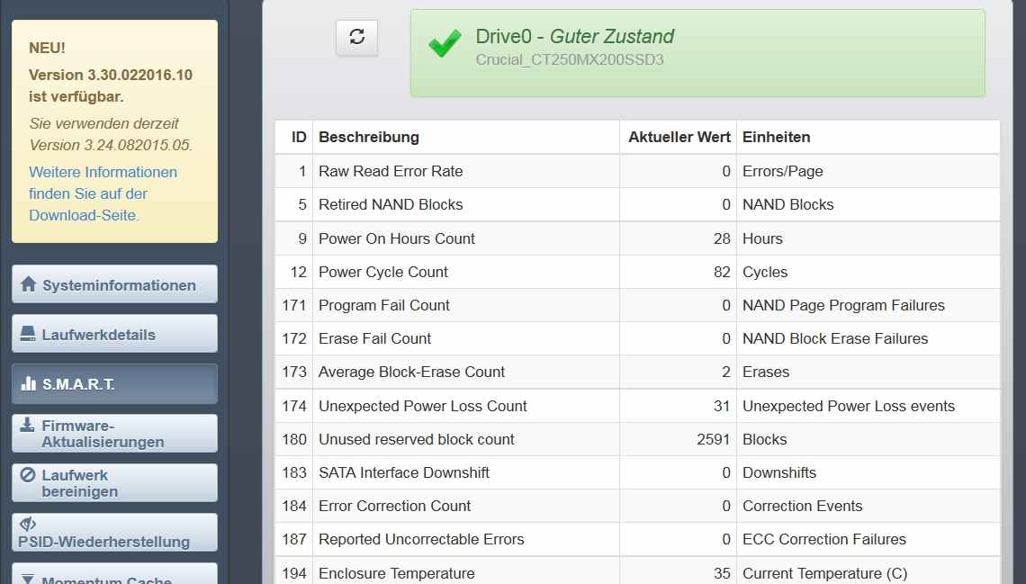 Auch diese geringe Betr.stunden-zahl ist komisch, 28 Std in einer Woche ist unwahrscheinlich, der Rechner (HP 2540P) in dem sie verbaut ist, läuft gut 8 - 10 Std am Tag x ~ 7 Tage, das sollten/könnten gerne 70 Std. sein!