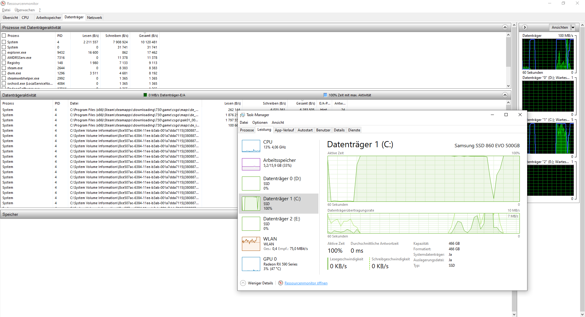 Die Bilder vom Taskmgr/Ressourcenmonitor sind während eines Steam updates entstanden.