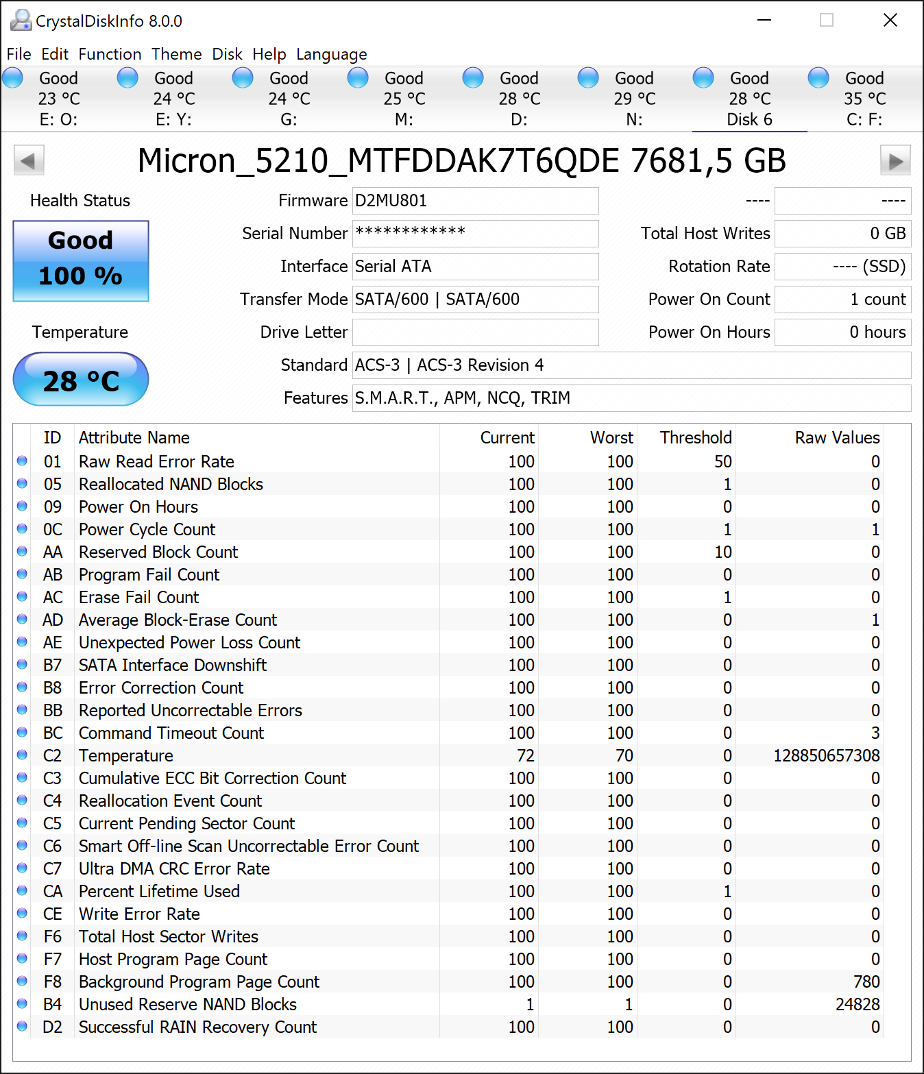 In den SMART Werte aus CrystalDiskInfo, sieht man eine außergewöhnliche Menge an Reserveblöcken.