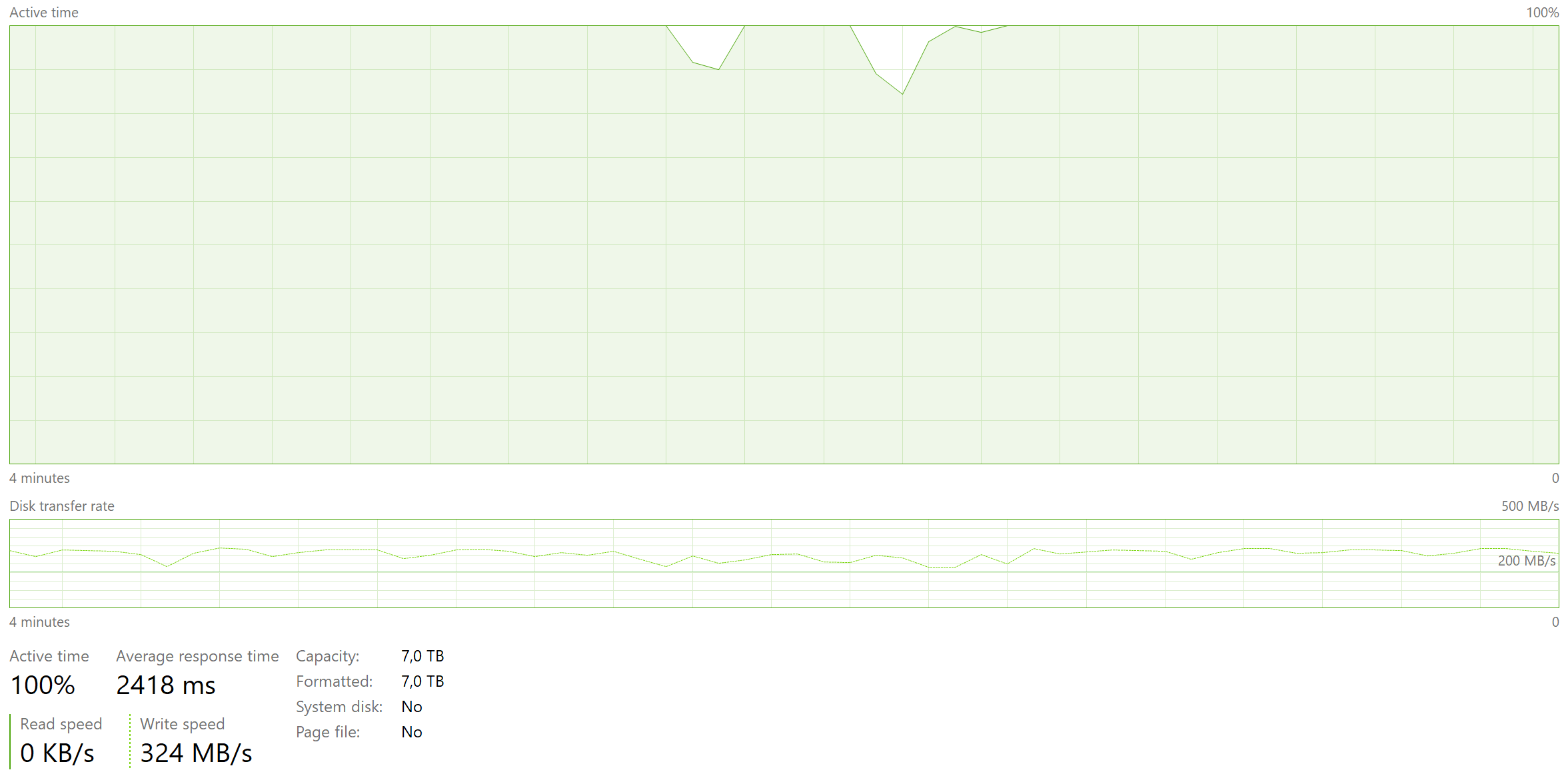 Das Ergebnis zeigt eine konsistentere Geschwindigkeit, die nicht mehr die deutlichen Schwankungen unter 200 MB/s zeigt. Das heise Tool lastet die SSD icht zu 100% und es gibt durchgängig so 320 MB/s.