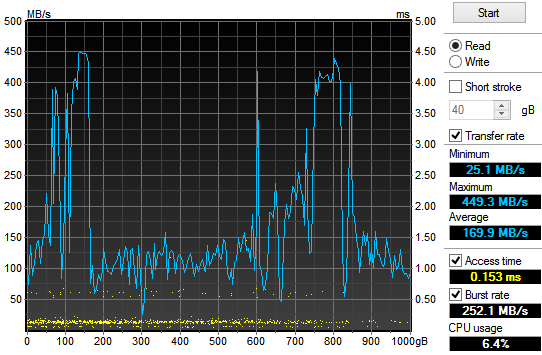 Als das kopieren noch mit den üblichen 400 MB/s ging war auch die Leserate im HD-Tune konstant über 400 MB/s.