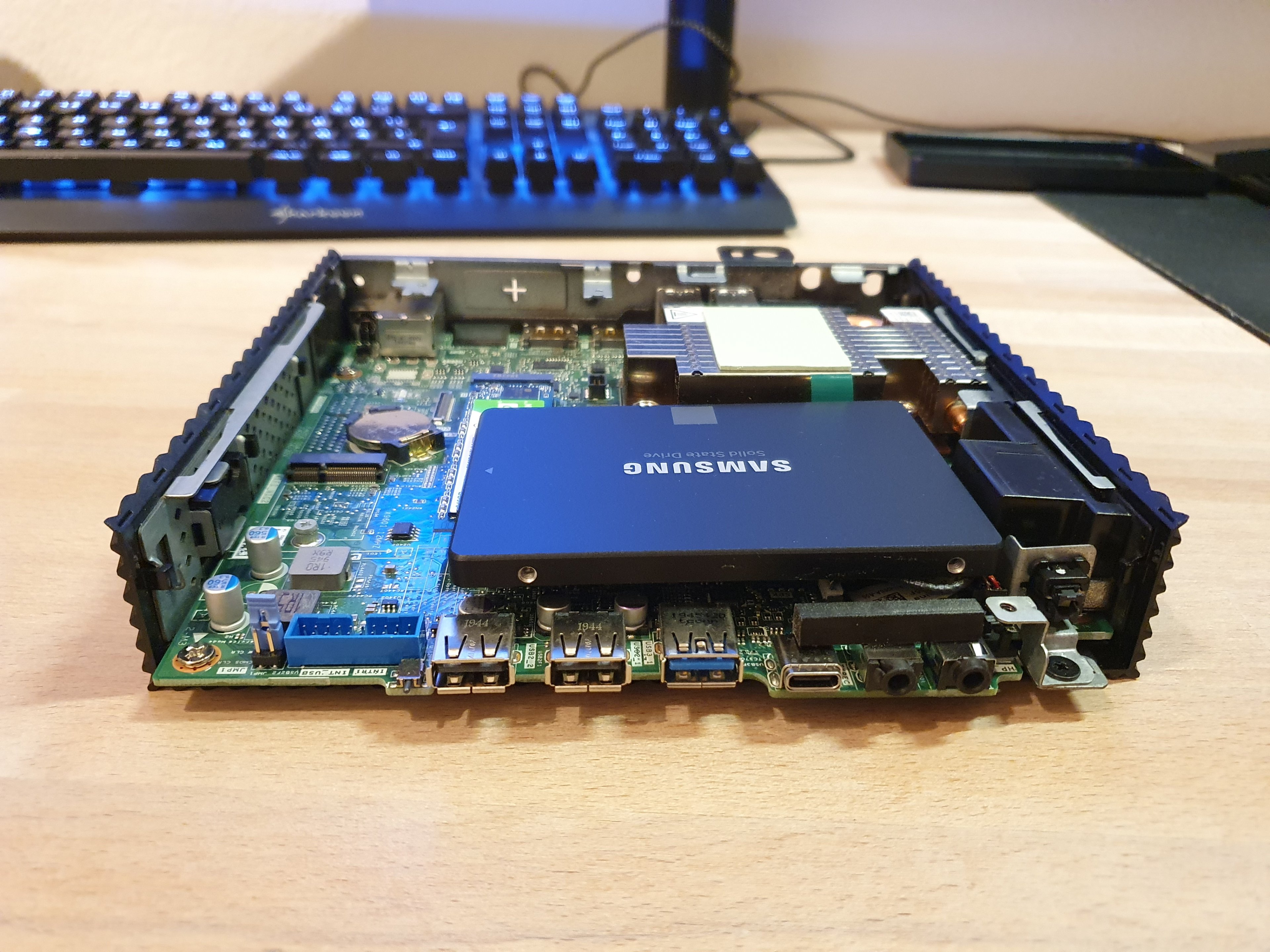 Habe Anfang des Jahres was ähnliches vor gehabt. SATA kannst du intern mit einer M.2 zu SATA Platine realisieren. Vorausgesetzt du entfernst die WLAN Karte so wie bei mir im Bild. Spannungsversorgung für die SSD geht auch nur mit +5V und GND, da bietet sich z.B. der interne USB3 Header für an. Ist zugegebener weise viel Bastelarbeit, aber zumindest eine 2.5" SSD ist so intern an SATA möglich, wenn man ein bisschen quetscht und die SSD noch von ihrem Gehäuse befreit, könnte man bestimmt auch zwei SSDs intern realisieren.
