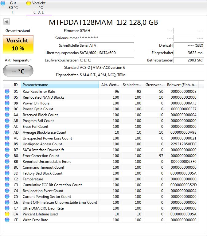 Das ist eine Micron C400, das Schwestermodell der Crucial m4 im mSATA Formfaktor und die NANDs der m4 haben in einem in einem Dauerschreibtest über 36477 P/E Zyklen (also zwölf mal so viele wie spezifiziert) durchgehalten, dass Attribut AD war wieder bei 165, da es umlaufend ist, also nachdem es auf 0 fällt auf 255 geht. Es wäre wirklich hilfreich den ganzen Screenshot mit allen Attributen zu sehen, die Seriennummer kann man unter Optionen ausblenden lassen solltest Du deswegen Bedenken haben, damit man den Zustand bewerten kann, aber ich denke es besteht kein Grund die SSD zu ersetzen, die wird rein von den NANDs her noch ein Vielfaches der Zeit halten die sie schon gehalten hat.vibi1994 schrieb:Als SSD ist bei mir eine MTFDDAT128MAM-1J2 verbaut.
