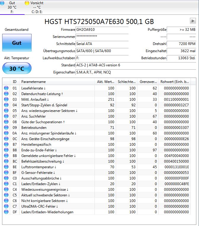 Die NANDs haben 2712 der spezifizierten 3000 P/E Zyklen runter, aber die NANDs sollten wie gesagt ein Vielfaches davon schaffen. 4 mal sind NAND Blöcke schon ausrangiert worden, aber es gab auch ein paar unerwartete Spannungsabfälle, da kann sowas schon mal die Folge sein. Ich denke die SSD wird noch eine Weile halten. Die HDD dürfte die 5 Jahre vom geplanter Nutzungsdauer schon oder bald hinter sich haben, die halten meistens länger und die Werte sind bestens, aber ein Backup sollte man sowieso immer haben, auch weil eben nicht nur Hardwareausfälle zu Datenverlust führen können. Gerade bei mobil genutzten Notebooks sind Stöße oft nicht zu vermeiden und der G-Sensor der HDD hat schon 0x53 = 83 stärkere Stöße registriert (während des Betriebs, wenn die ausgeschaltet ist kann er ja nichts registrieren) und in der Hinsicht sind HDD wie ein Boxer, die oft eine Menge Schläge einstecken, aber manchmal schickt der eine Schlag sie auf die Bretter. Daher würde ich in mobil genutzten Notebook keine HDDs verbauen wollen.