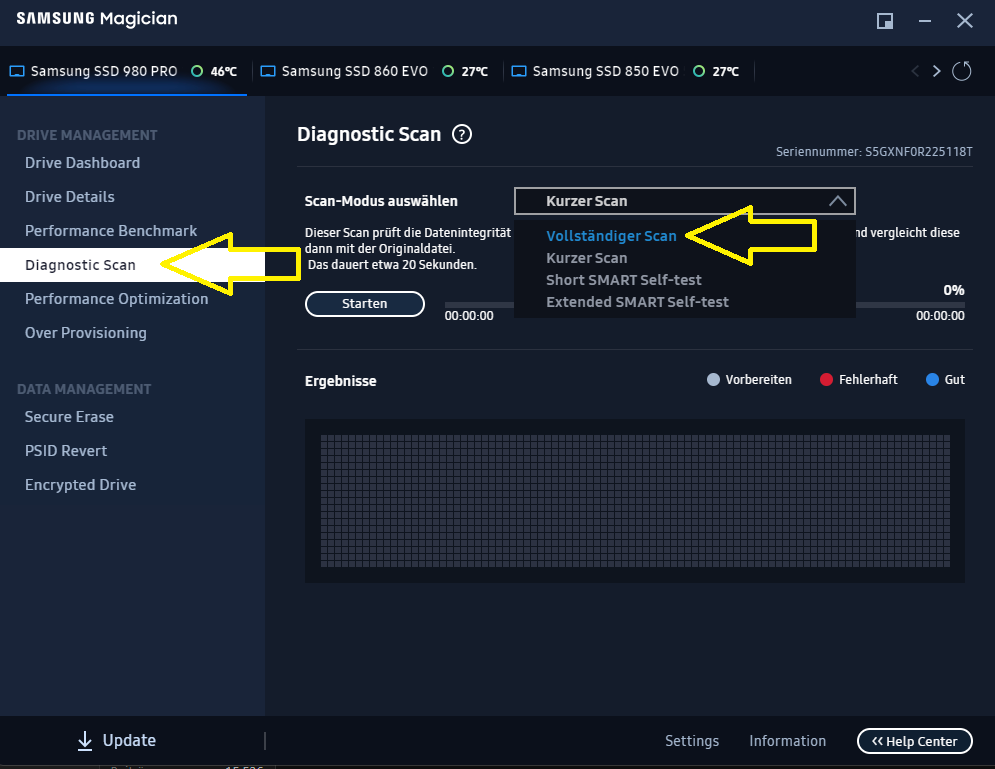 Fertig. Für Punkt 2 eine Software deiner Wahl nehmen. Hddscan oder Victoria würde sich anbieten. Für einen Schreib-Test muss die SSD unpartitioniert sein! Hat den Magician nichts in der Richtung an Bord?