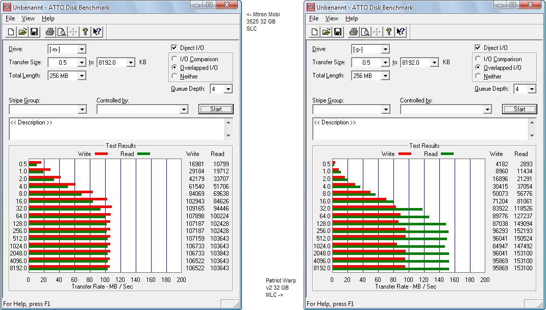 Habe nun die Patriot Warp v2 32GB (MLC) und die Mtron Mobi 3500 32 GB (SLC), jeweils 2,5'', getestet.