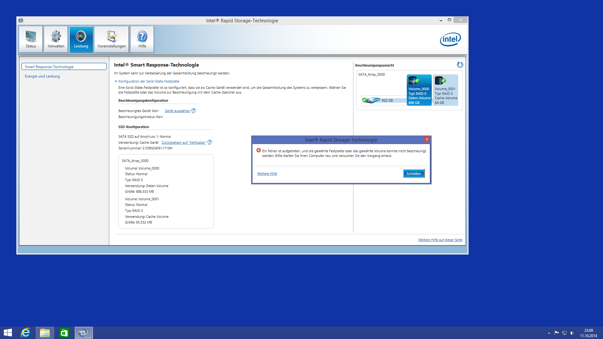 SSD Caching bricht mit Fehlermeldung ab / Intel Smart Response