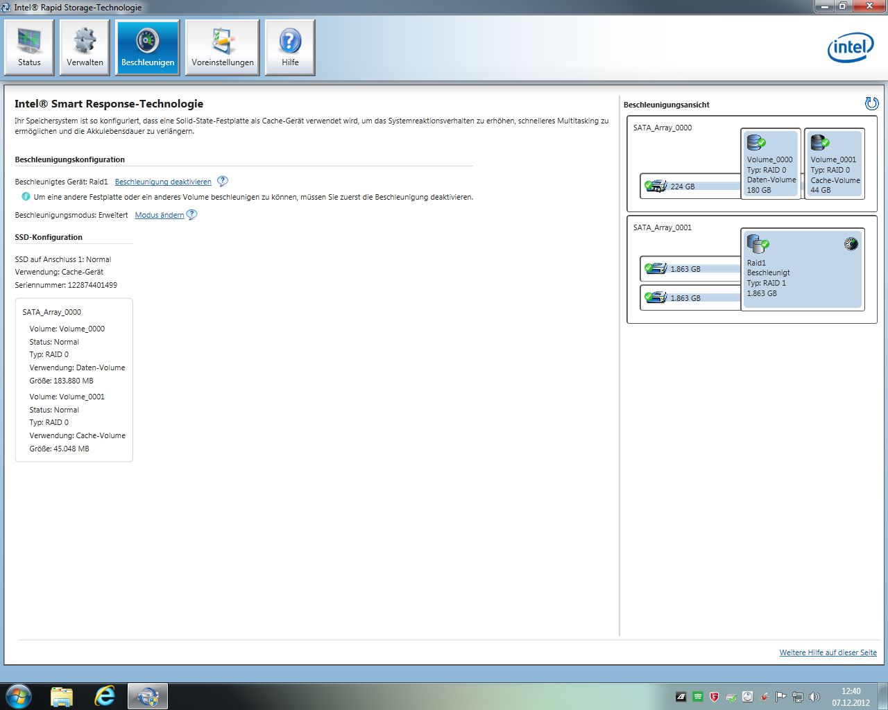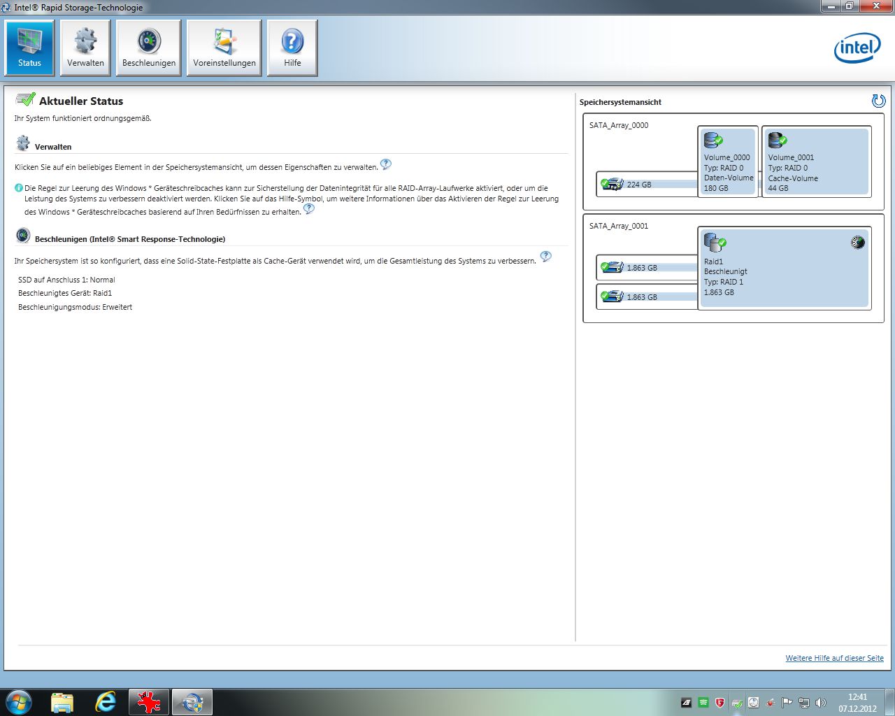 Das RAID und die SSD werden im Rapid Storage einwandfrei erkannt, allerdings fehlt die Möglichkeit das Caching zu aktivieren.
