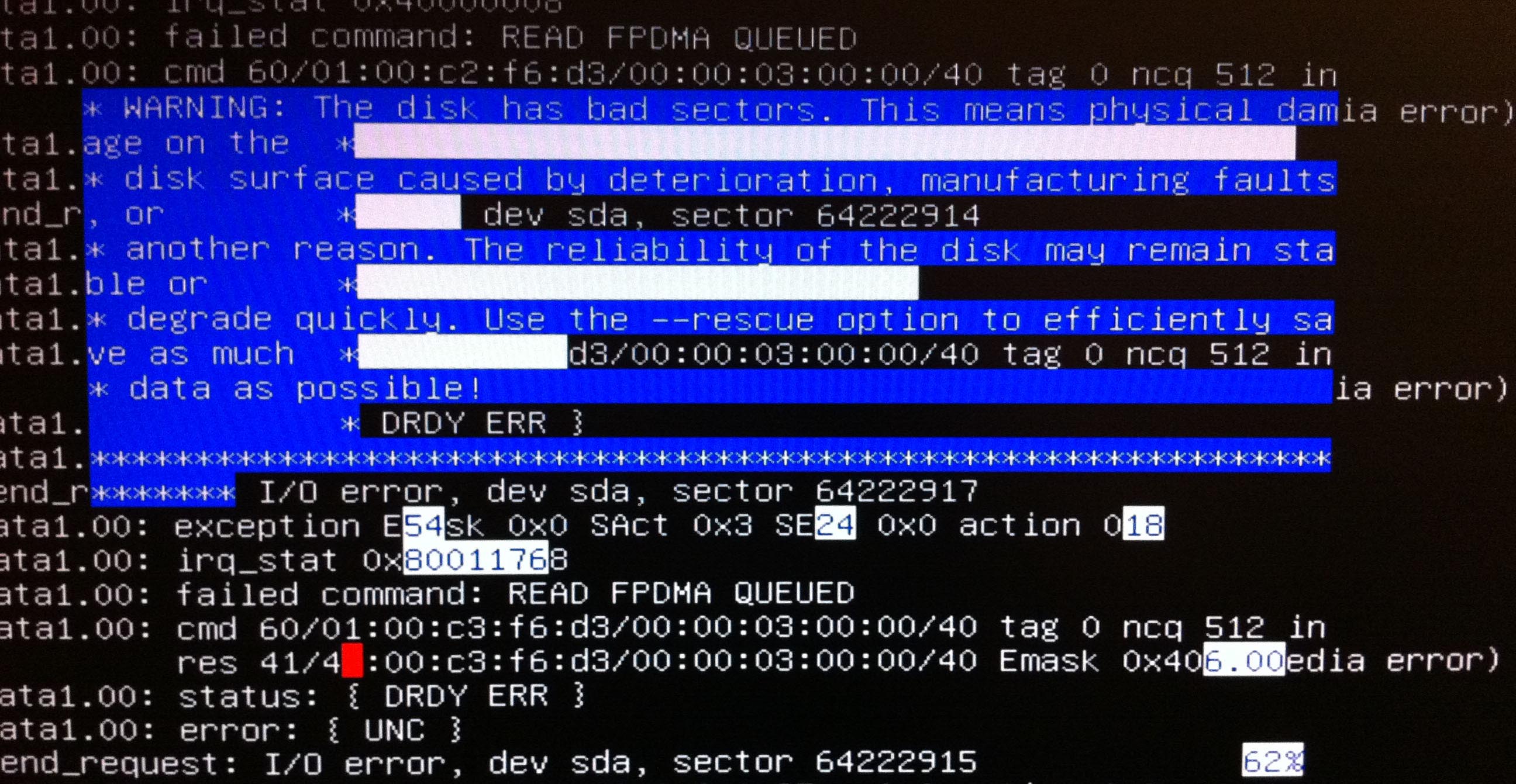 "Warning: The disk has bad sectors. This means physical damage on the disk or another reason. The reliability..." (siehe screenshot)