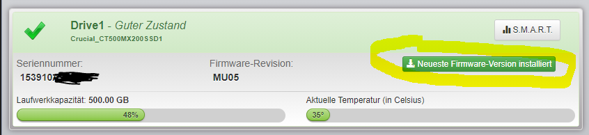 Laut dem Tool von Crucial ist die SSD in Ordnung und die neuste Firmware ist installiert.