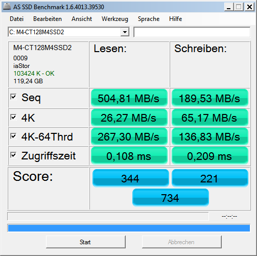 Hallo. Ich habe eine Cruitical M4 128er Platte und hatte immer schlechte Werte. Nachdem ich die neue Firmware installierte habe, blieben einige Werte weiterhin sehr schlecht. Im Forum hatte ich den Tip bekommen mal im abgesicherten Modus zu starten und hatte normale/gute Werte. Hier mal ein paar Eckdaten: